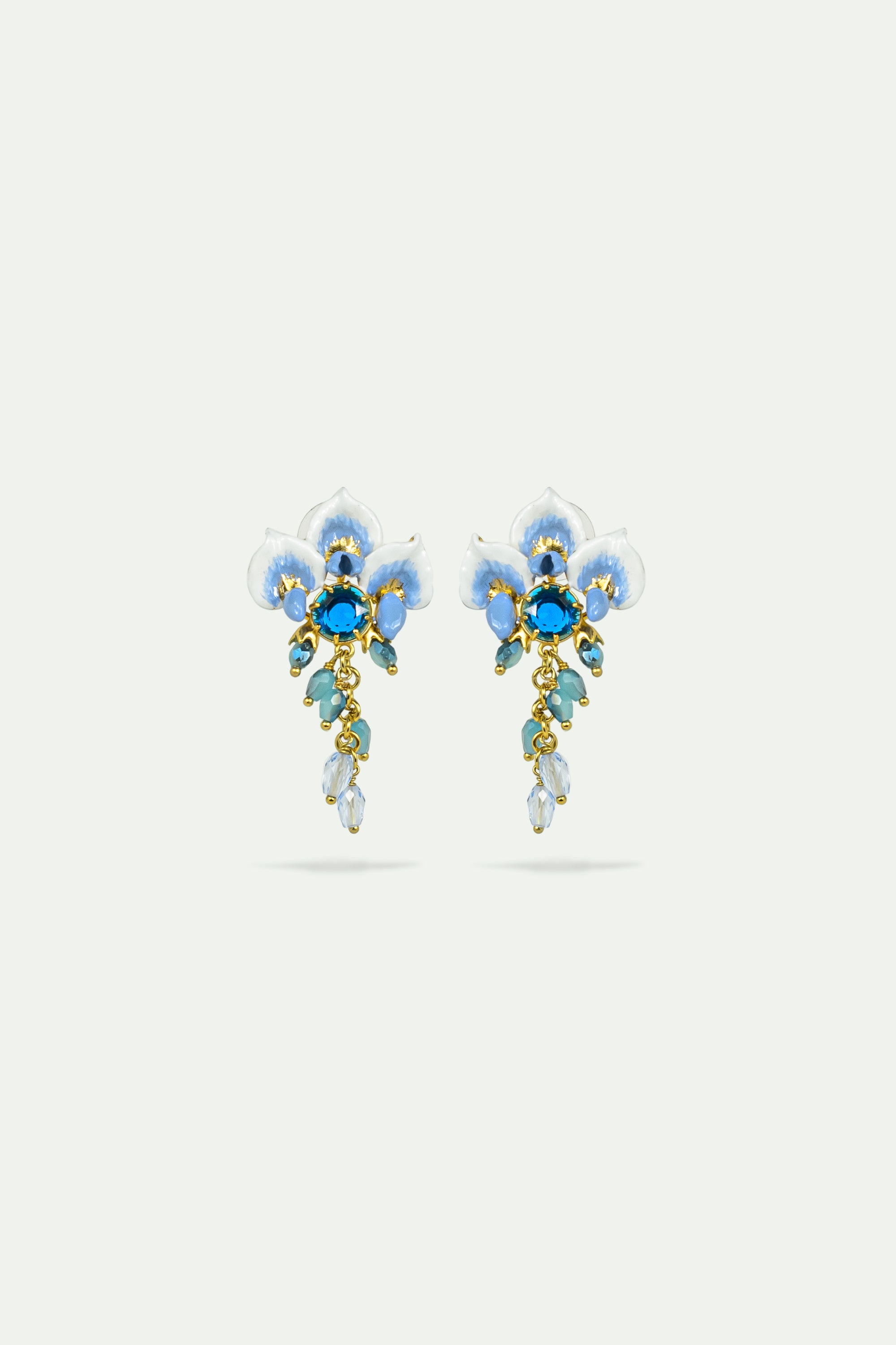 These earrings showcase wisteria flowers with a faceted blue glass stone in the centre.The petals are delicately hand-enamelled in shades of blue and white. Wisteria buds made of faceted glass bead...See more