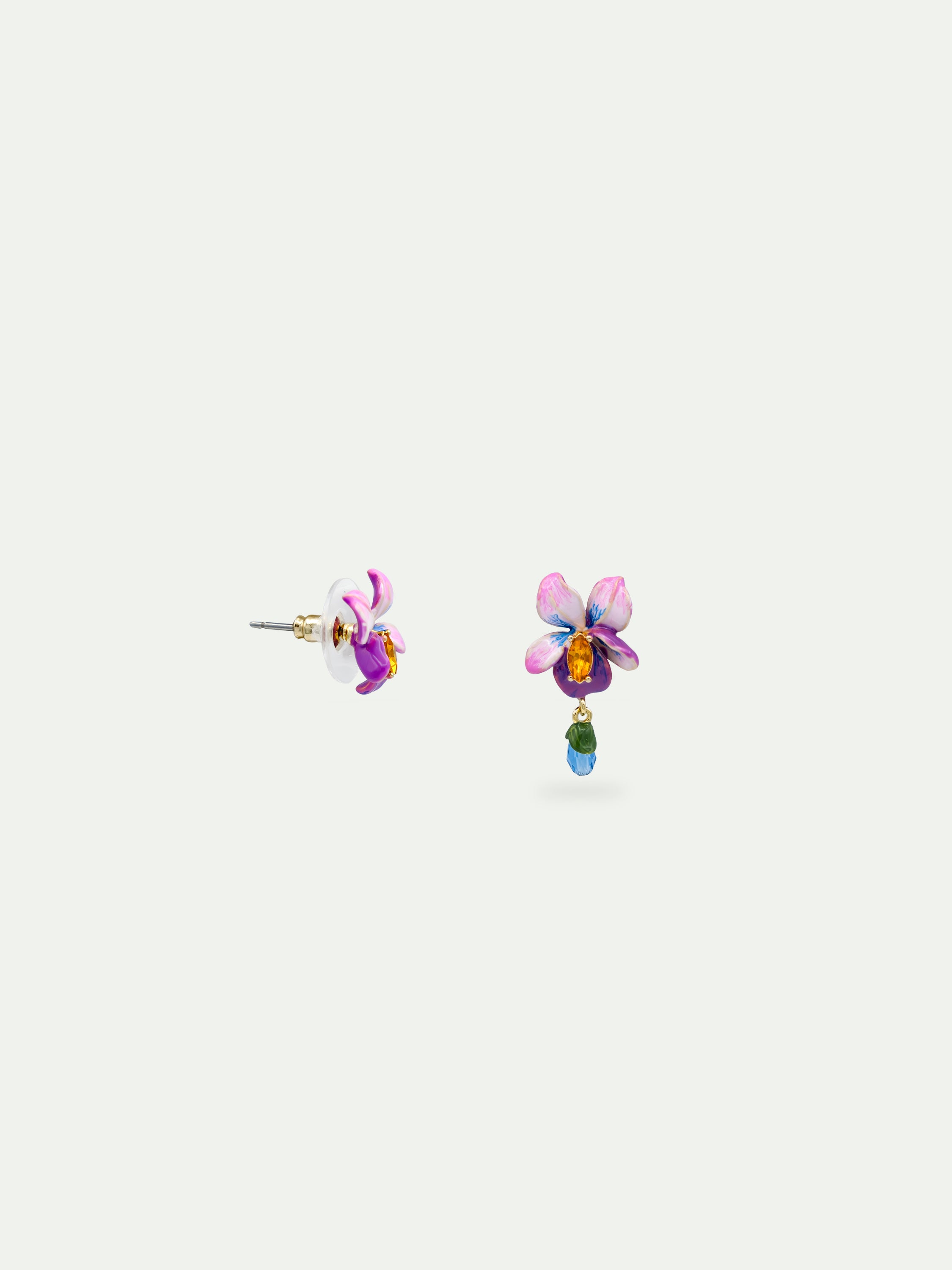 Boucles d'oreilles tiges asymétriques fleur de violette et pierre bleue