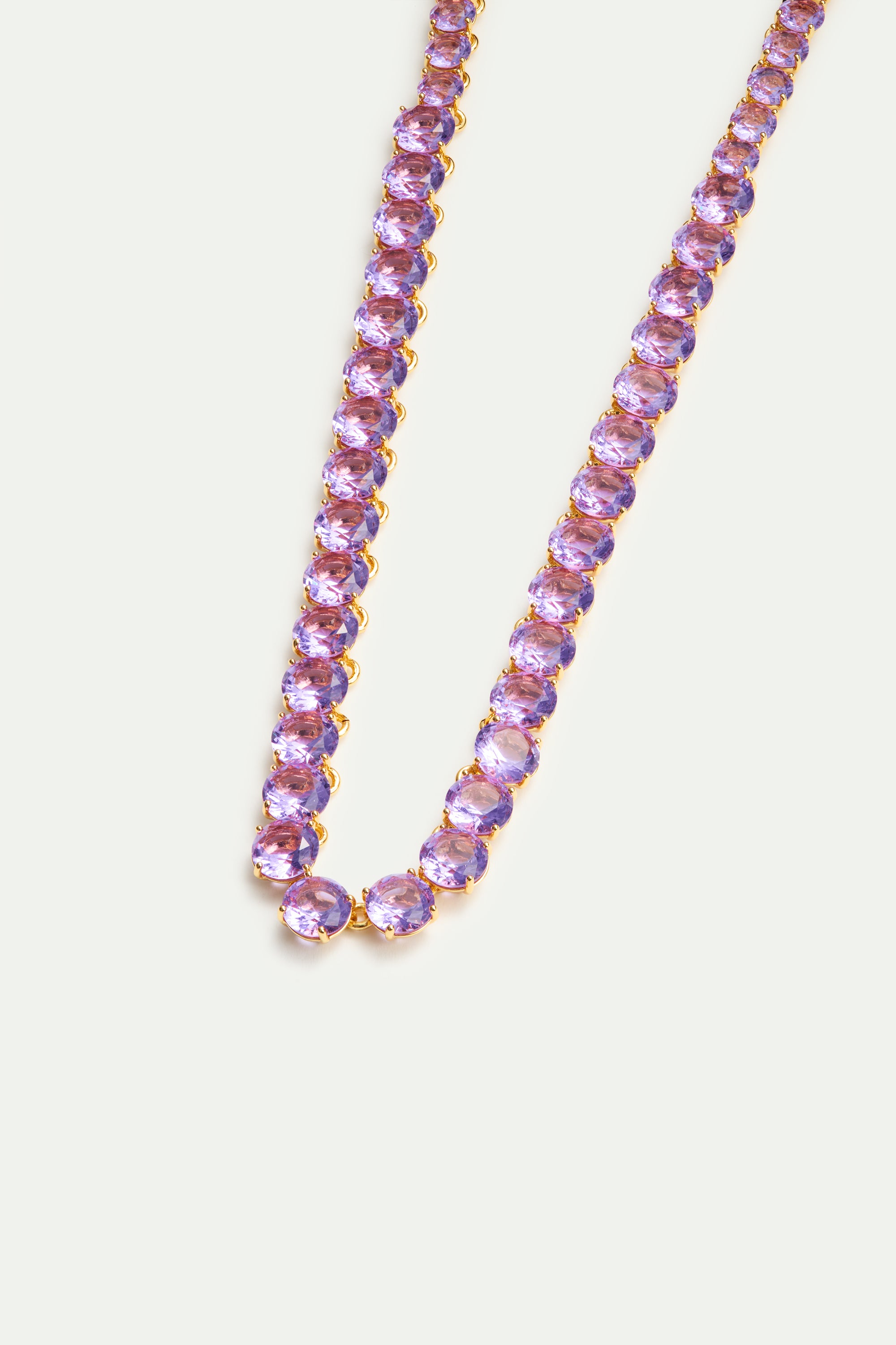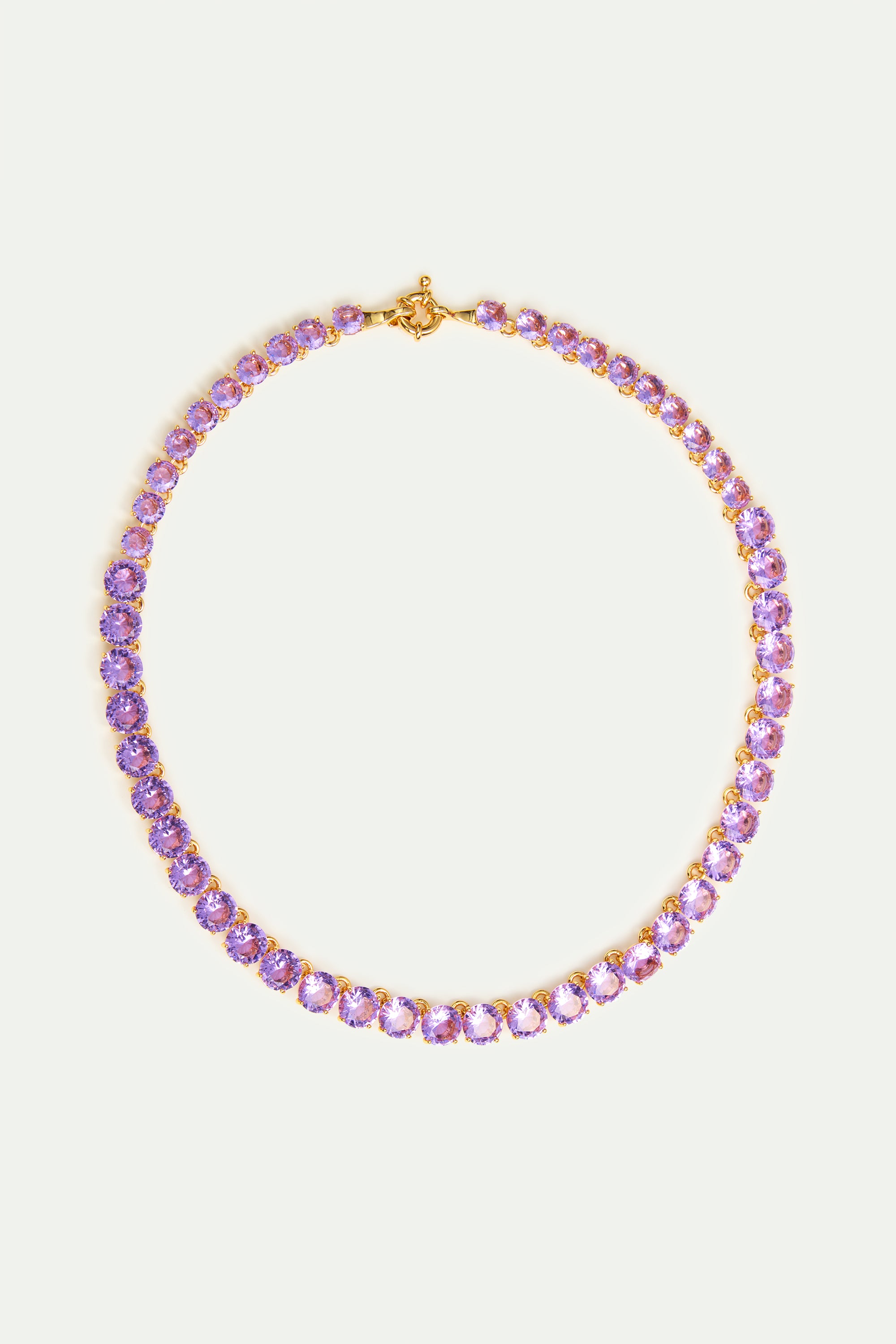 Collier ras de cou pierres rondes en verre facetté violet. L’élégante Diamantine se transpose cette année en Provence. La collection revêt le raffinement bucolique d’une prairie où marguerites et ...Voir plus