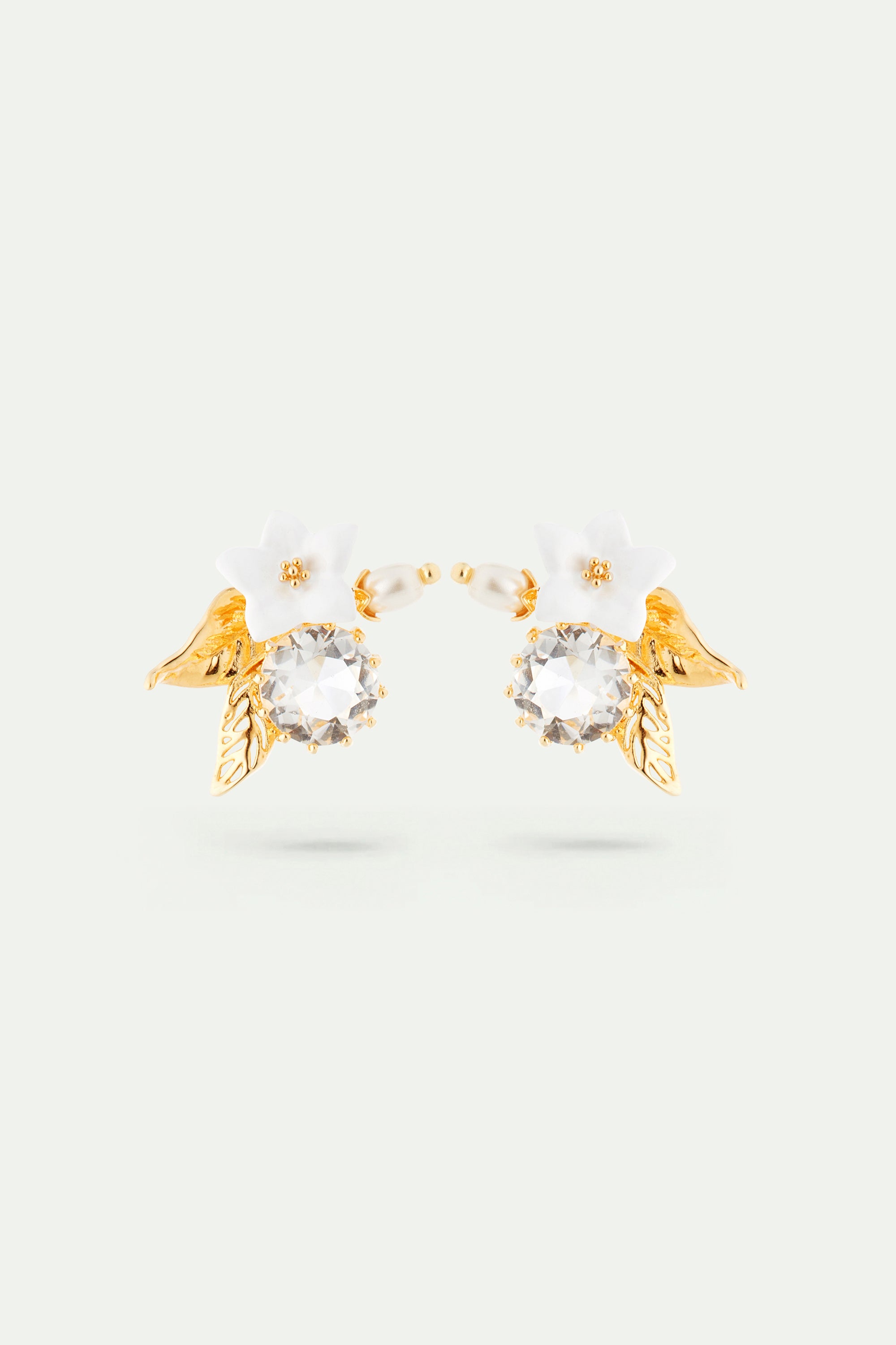 Boucles d'oreilles tiges jasmin officinal blanc, cristal facetté et perle fantaisie