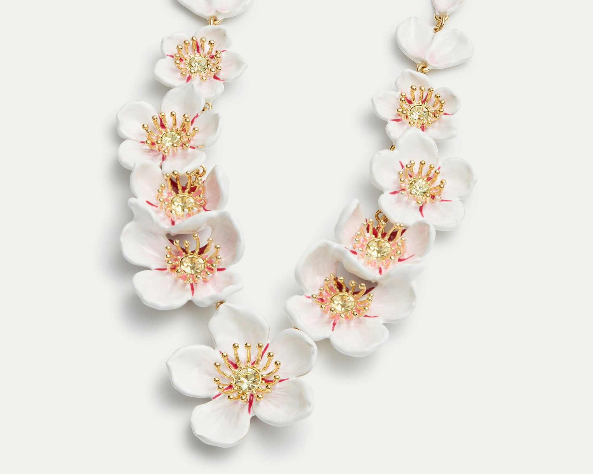 Collier grande fleur de clématite blanche, corête du japon et laurier
