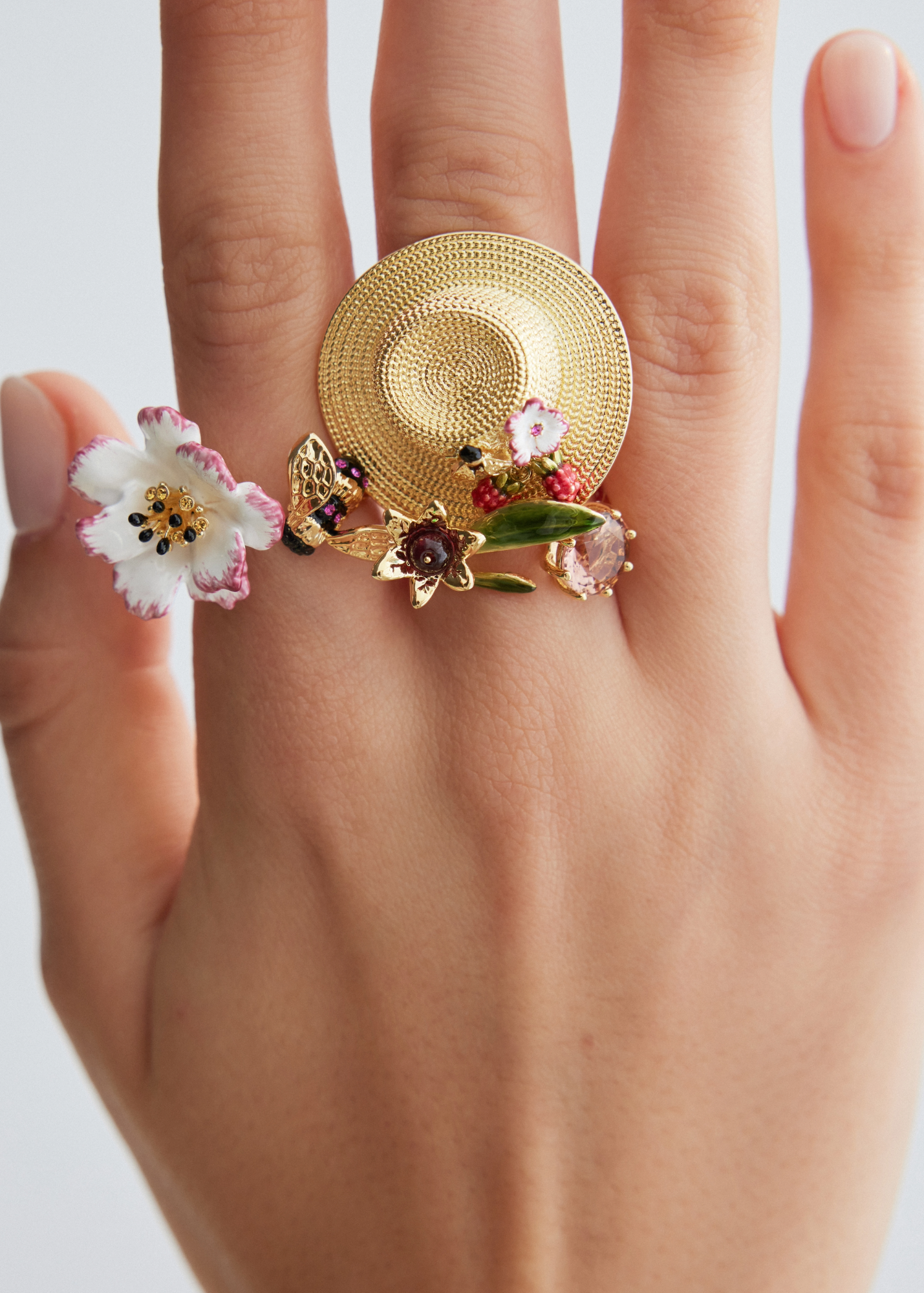 Bague chapeau doré, cosmos, abeille, framboise et cristal rose