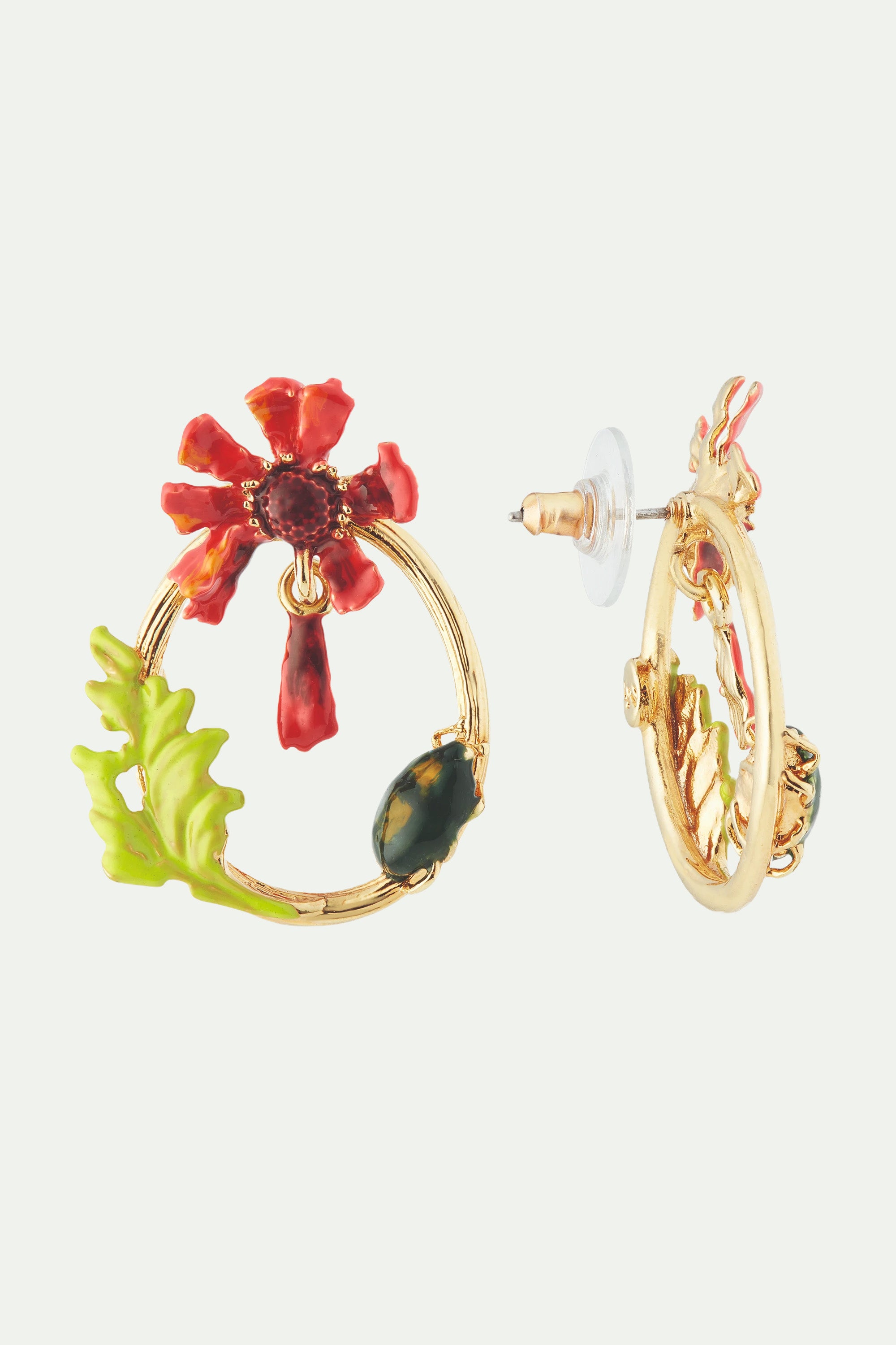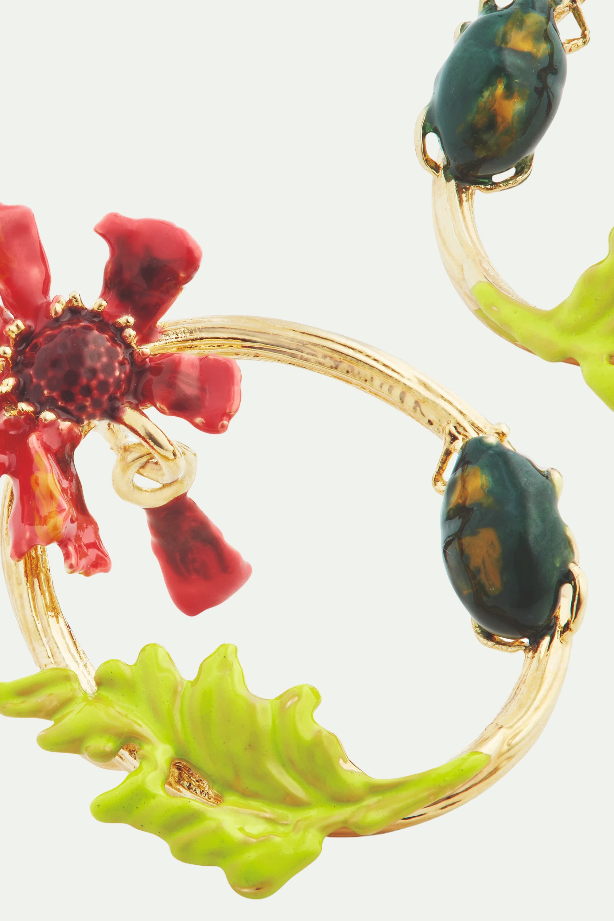 Here's a pair of scarab beetle and ephemeral flower hoop earrings that's sure to capture your attention. A delicately suspended red flower drops a petal into a gold ring, while a green and gold iri...See more