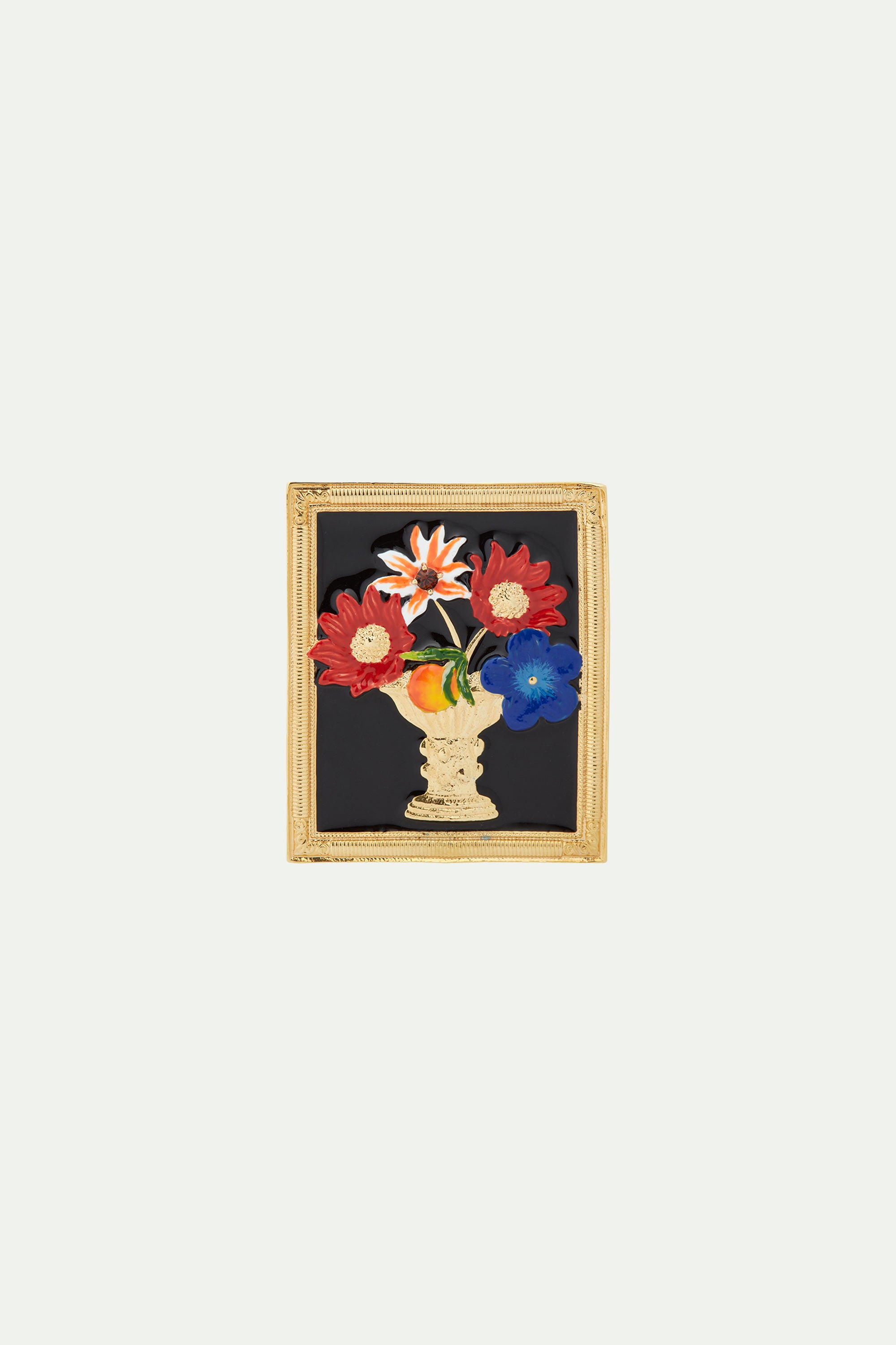 Brooch composed of hellebore flowers, bullfinch and leaves paved with cubic zirconia