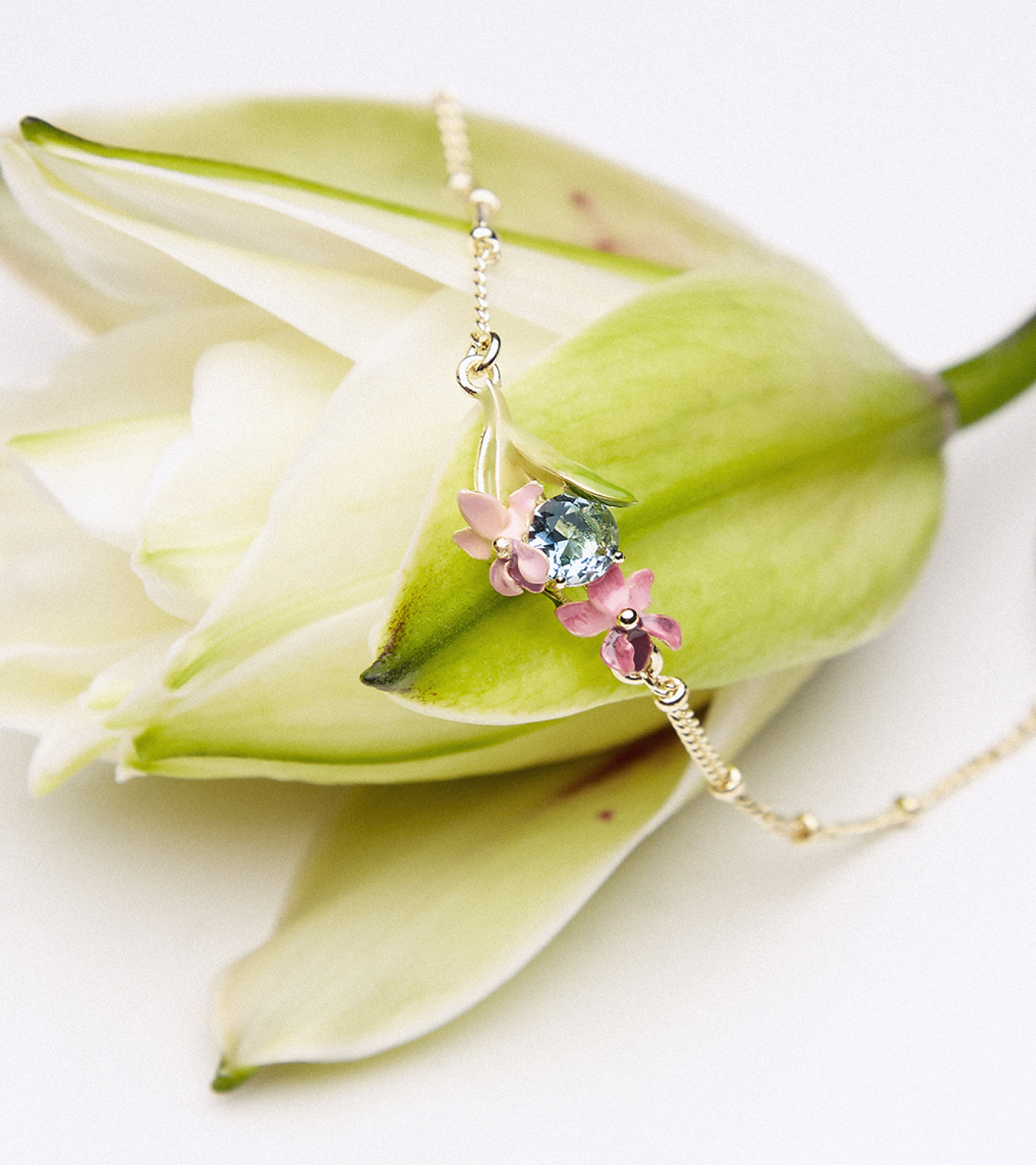 And it's built with the person who wears it because it's a dialogue of the senses and emotions. It's a talisman. A little totem of spring, berries and wild bouquets picked on holidays, coral and iridescent pearls, the nostalgia of a late summer or the playful flutter of a ladybird landing on our finger.