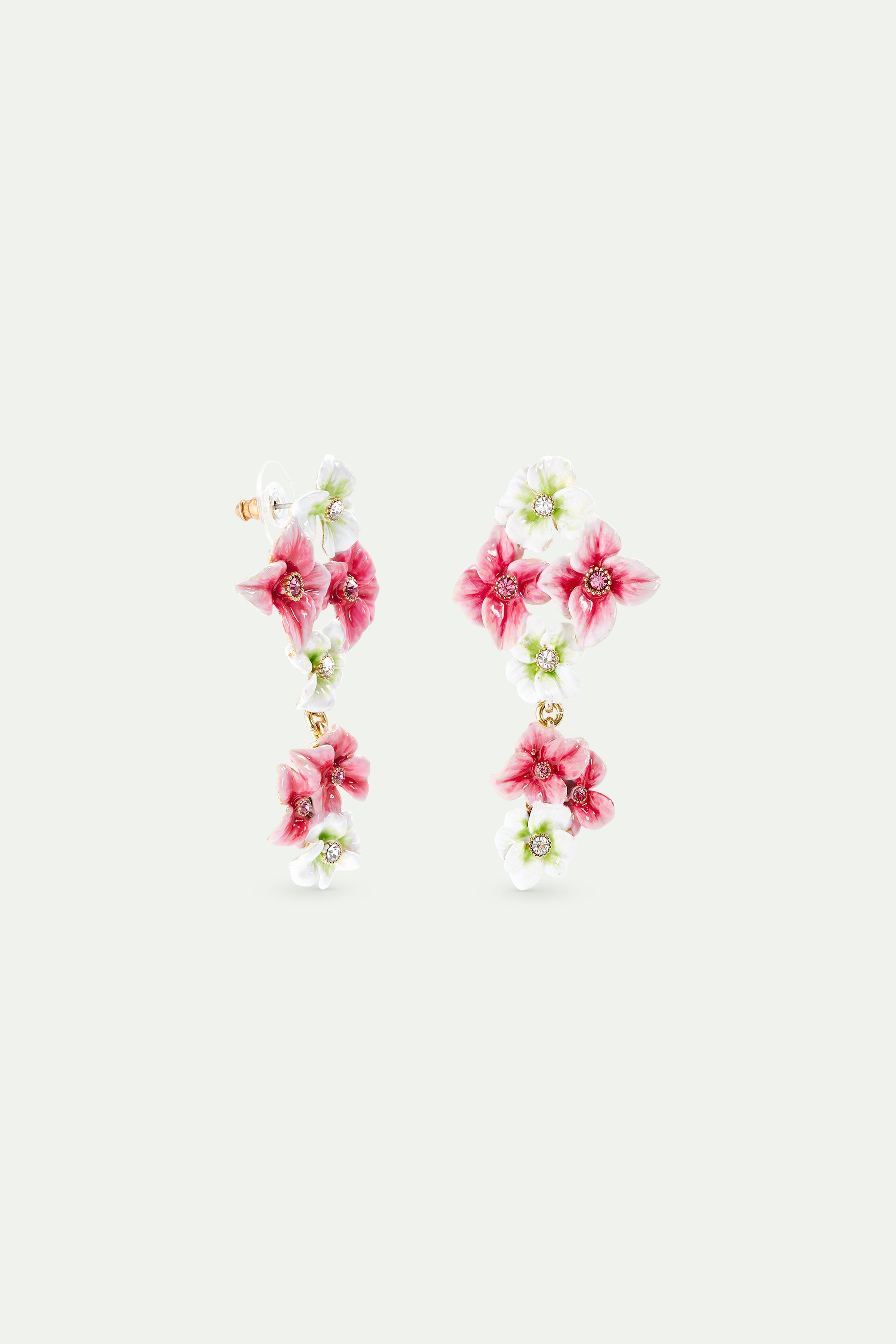 Dangle earrings representing a delicate bouquet of hydrangea flowers, hand-painted in pink and white, with faceted crystals in the centre, gold-plated brass setting.This collection is an elegant an...See more