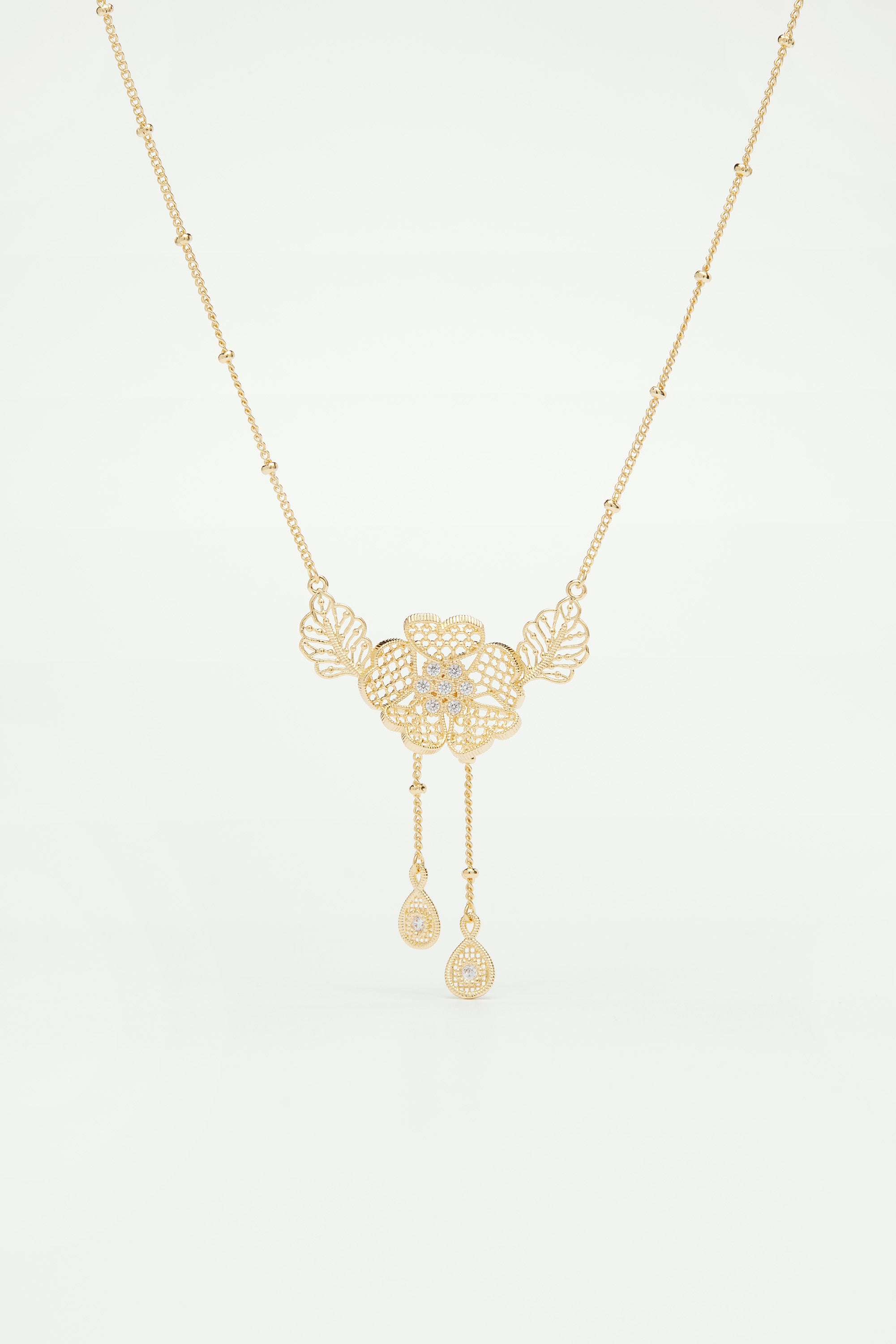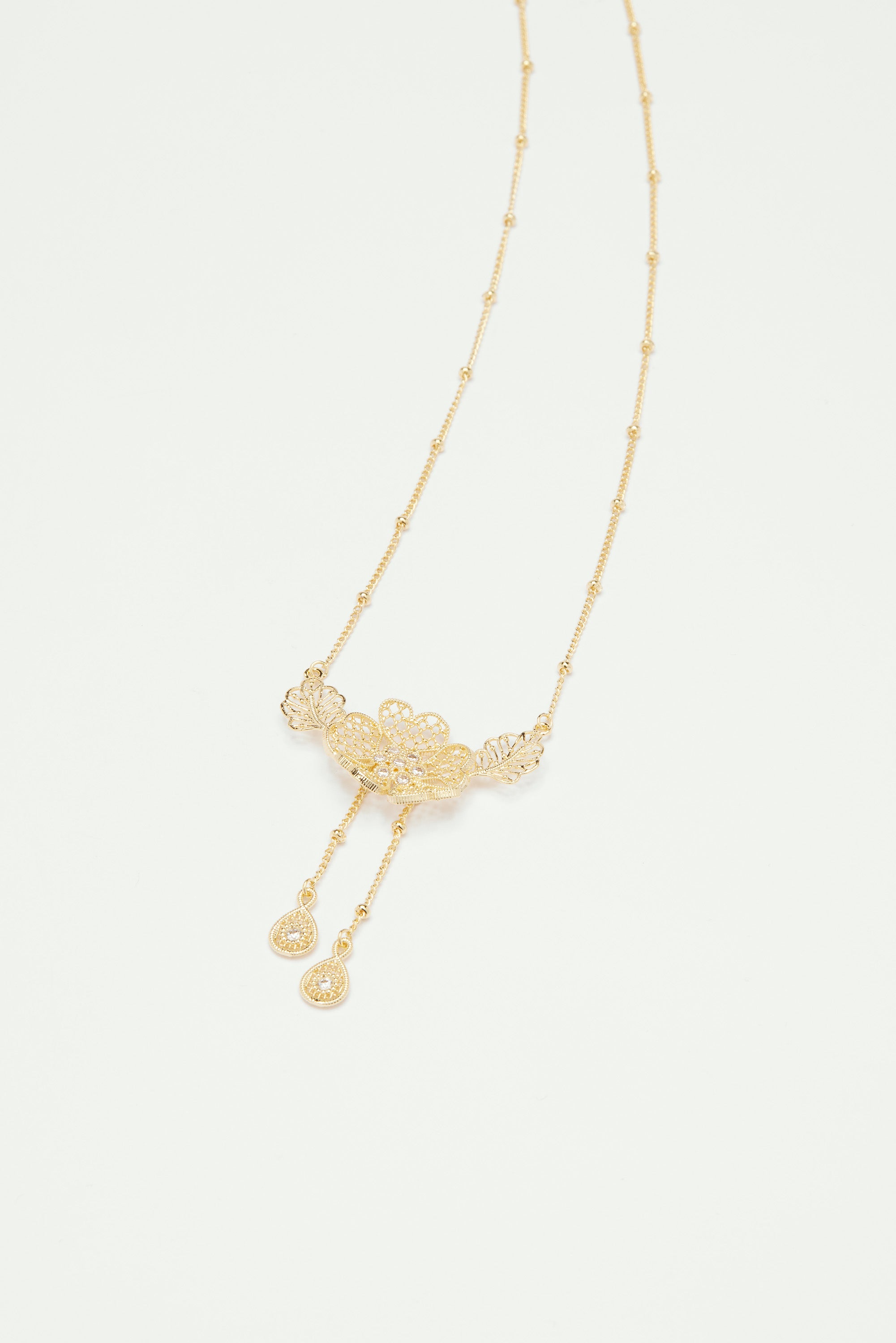 Two-tone chain, large pink magnolia flower and artificial pearl necklace