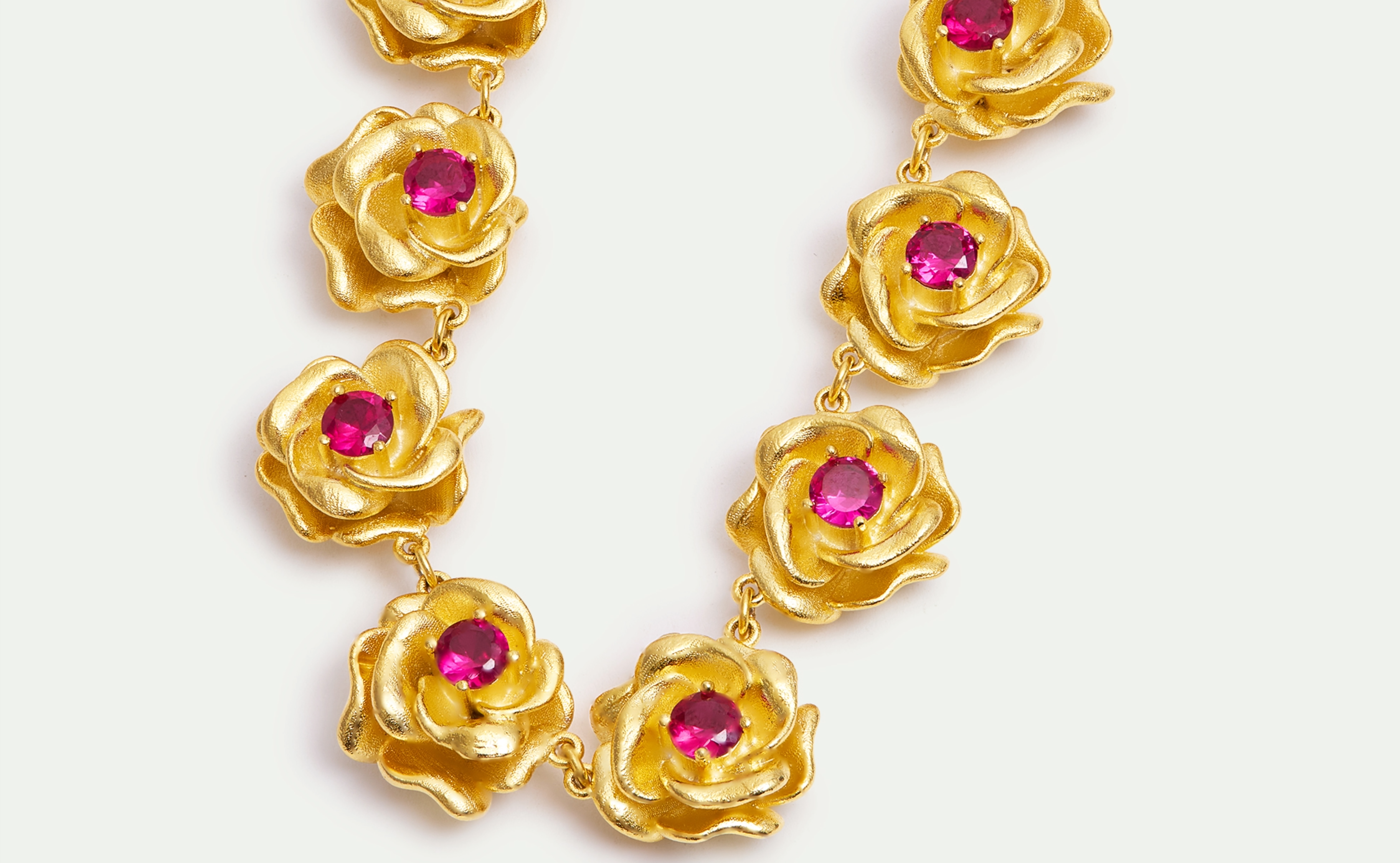Necklace with gold Mona Lisa roses and pink stonesNecklace with gold Mona Lisa roses and pink stones