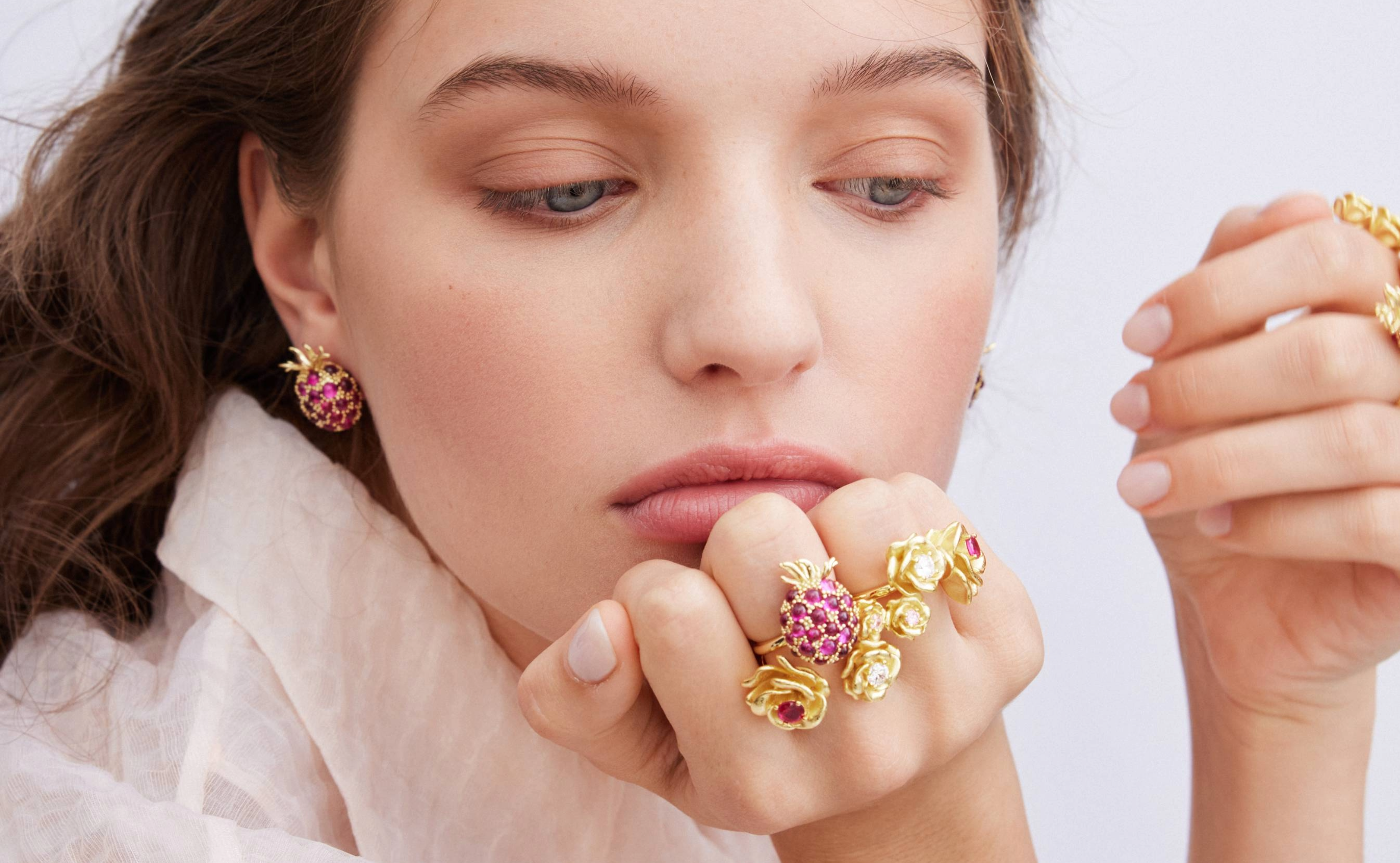 Une collection où fleurs, fruits et pierres lumineuses dialoguent comme dans un tableau vivant. Chaque bijou naît d’un dessin gouaché : pétales en laiton doré, framboises en cabochons, roses peintes à la main et pierres rondes facettées rose fuchsia. Les artisans appliquent chaque couleur au pinceau, nuance après nuance, rendant chaque pièce absolument unique.