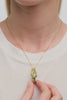 Pendant necklace showcasing a peacock with blue hues, surrounded by delicately hand-painted vine leaves. A faceted glass pear is hanging underneath the peacock.In the middle of a lush Eden, a myria...See more