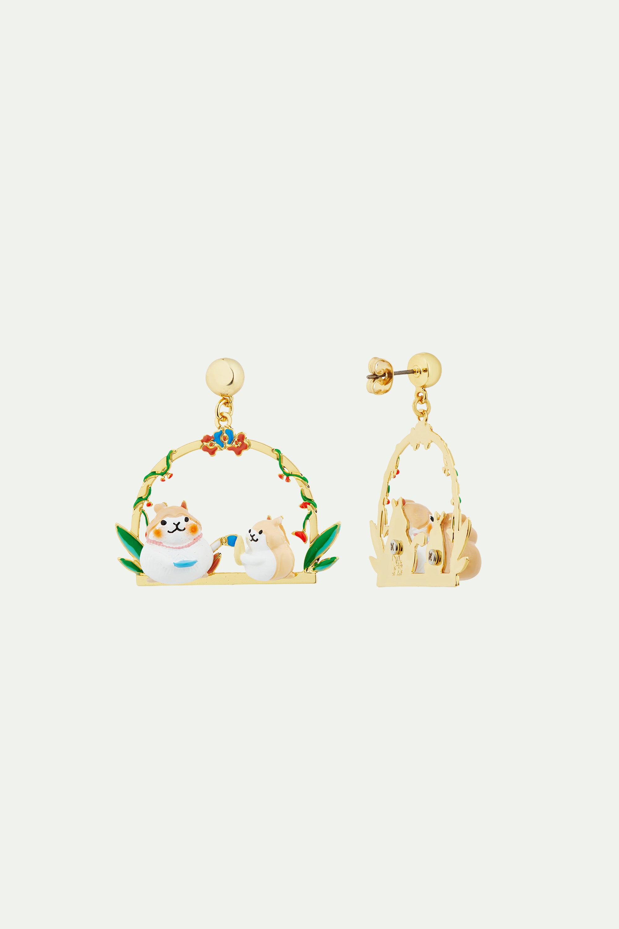 earrings, gold-plated brass circles, hand-painted hamsters having a tea break. These lovely companions are on the hunt for sunflower seeds.