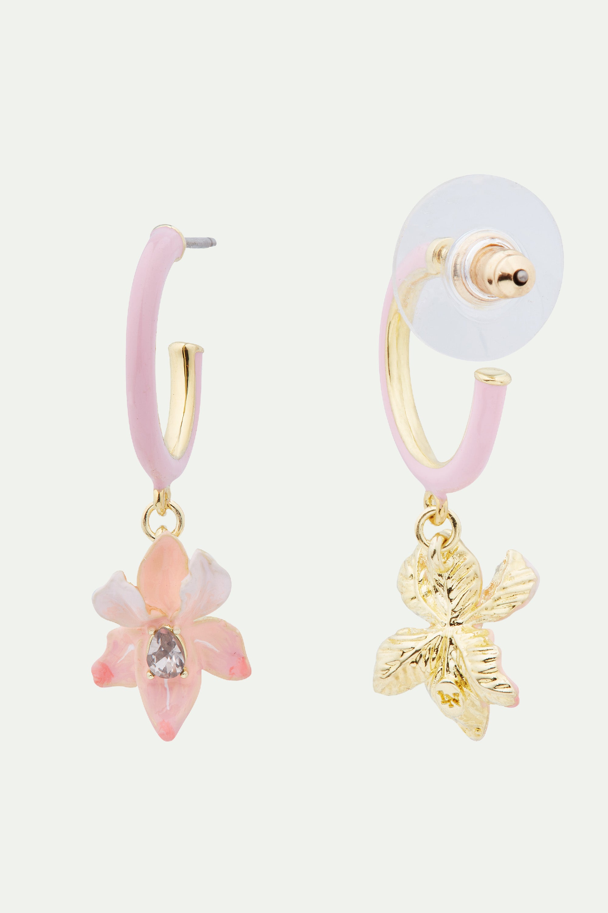 Pendientes asimétricos flor de hortensia esmaltada y piedra redonda lavanda