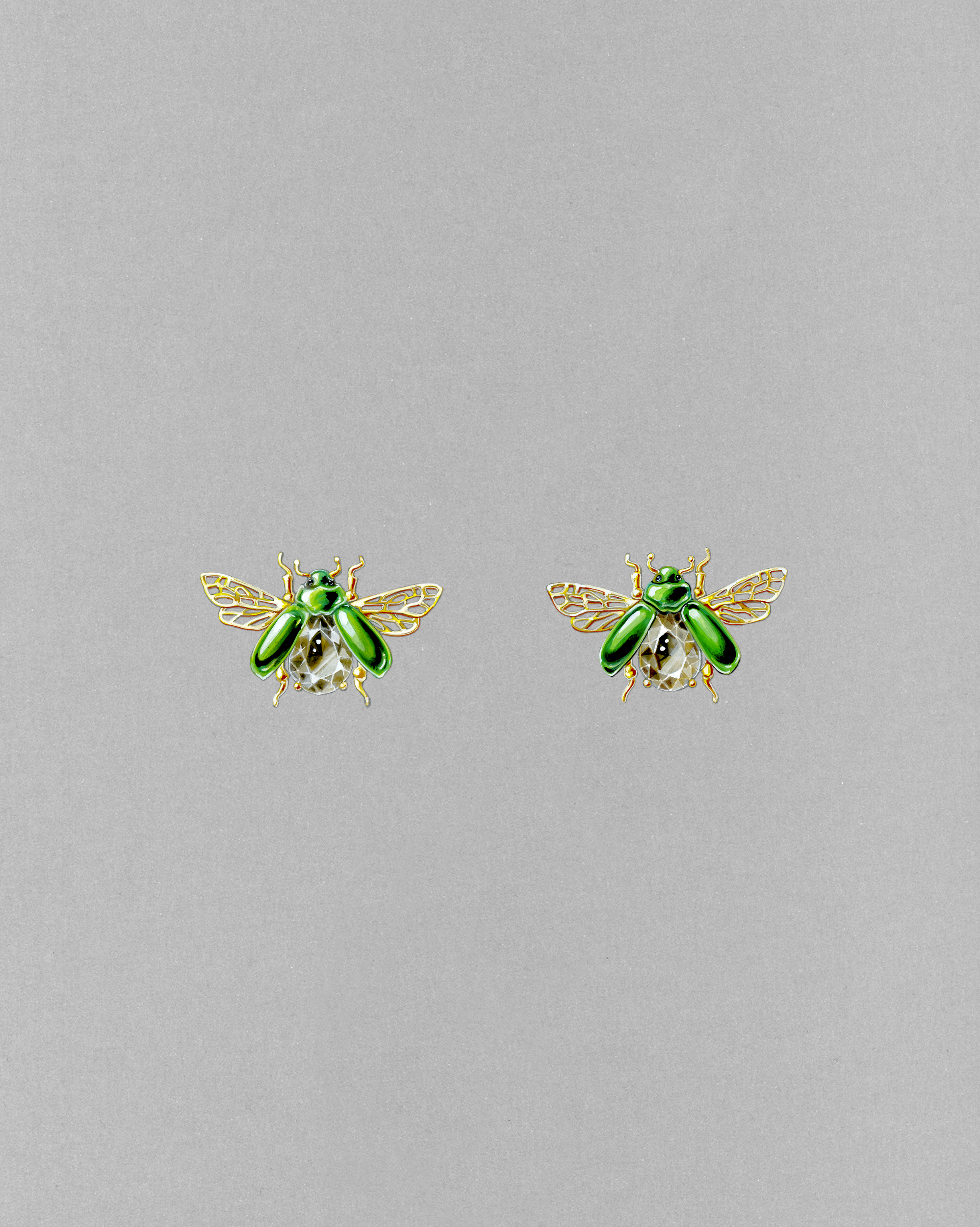 y naît d’un dessin tout droit sorti de l’imagination des créateurs. Comme en haute joaillerie, les pièces sont « gouachées ». Les bijoux sont ensuite fabriqués et subtilement peints à la main.