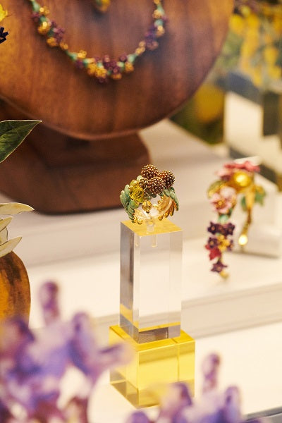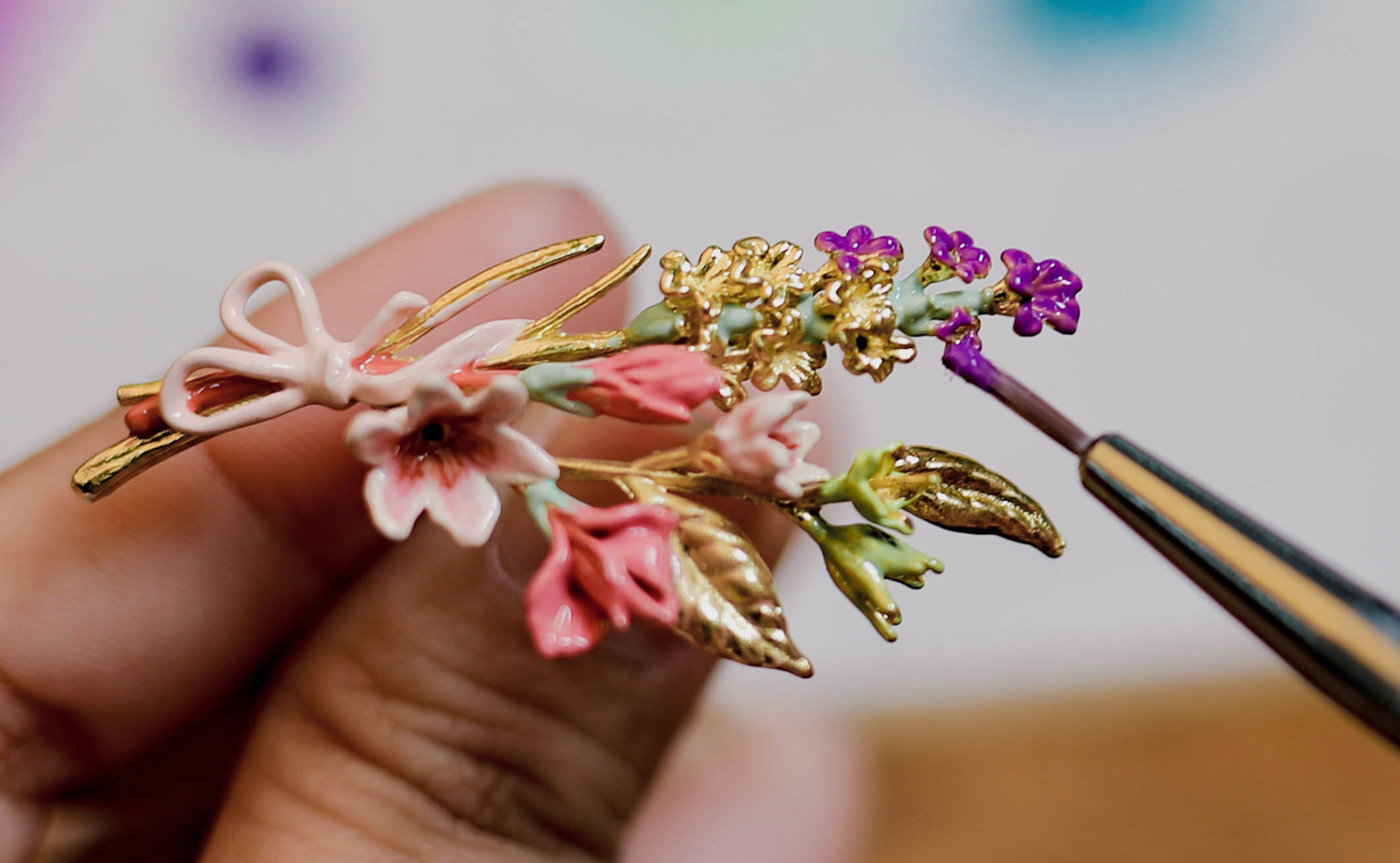 Chaque détail floral ou animalier est coloré au pinceau avec une grande subtilité dans le choix des couleurs. Une tâche minutieuse, où chaque détail est le résultat du travail à la main d’un artisan. Les pierres qui ornent les bijoux sont également taillées sur mesure, ainsi les pierres de verre de l’iconique collection La Diamantine ont été facettées spécialement pour cette occasion. Par ce travail sur le geste, chaque pièce est unique.