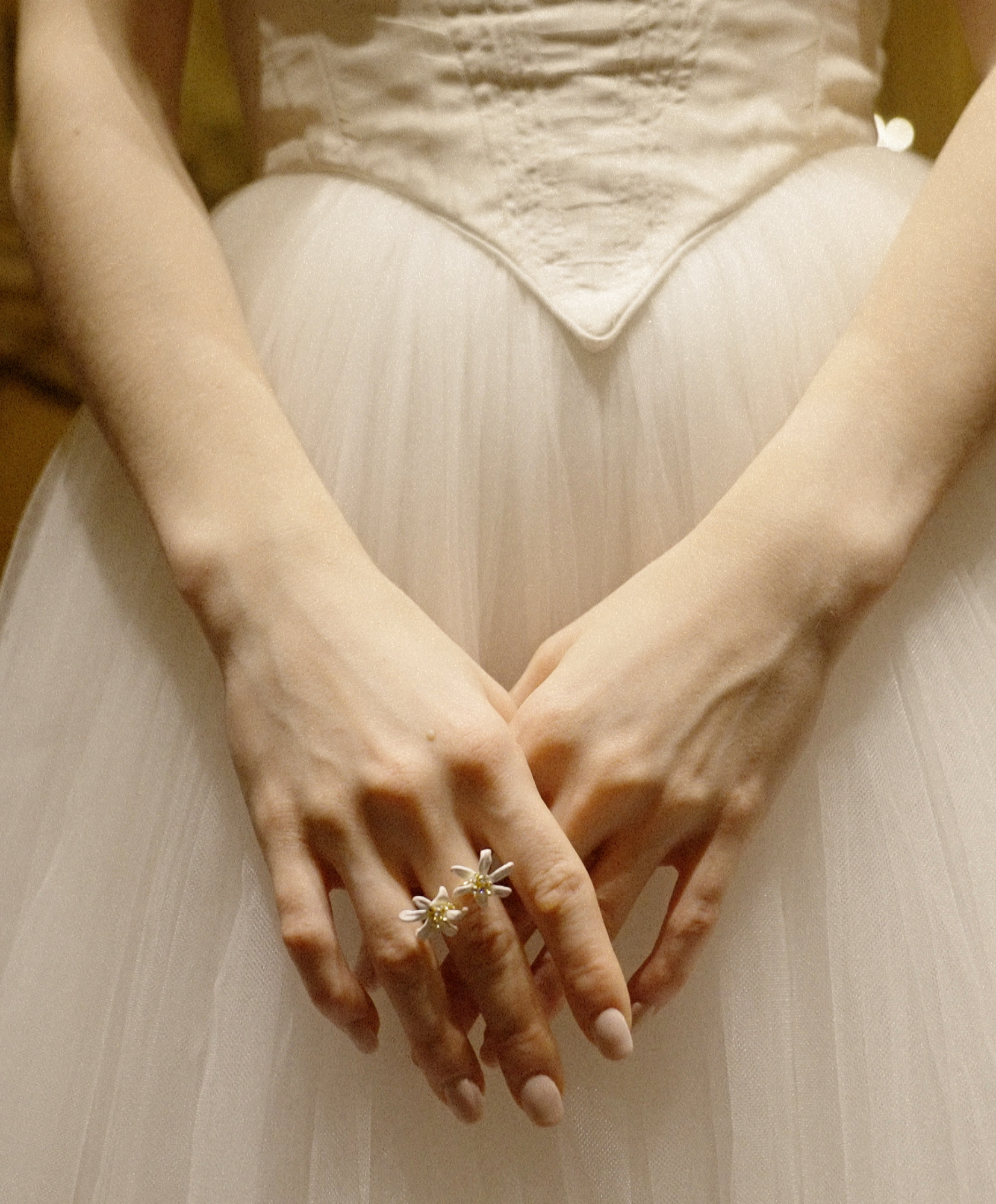 Pour célébrer les 150 ans du Palais Garnier, la Maison les Néréides a conçu trois parures distinctes, imprégnées de l'esprit de l'Opéra. Chaussons de verre et rubans d'or fin s'y déclinent en essentiels à qui veut être la plus belle pour aller danser. Ils vous mènent à la rencontre du plus romantique des ballets, ici mis à l'honneur: Giselle. Le rideau se lève sur une clairière où des lys fleurissent au bord d'une eau bleu pâle. Là, les nymphes dansent au clair de lune et tressent des couronnes de fleurs. Certaines chantonnent une mé-lopée, laissant s'écouler des larmes qu'elles recueillent au creux de leurs mains scintillantes. Les fleurs naturellement s'enroulent autour de ces cristaux liquides, s'empressant de les protéger. Ensemble, ils forment le testament d'un amour à jamais pur, qu'il ne tient qu'à vous de préserver.