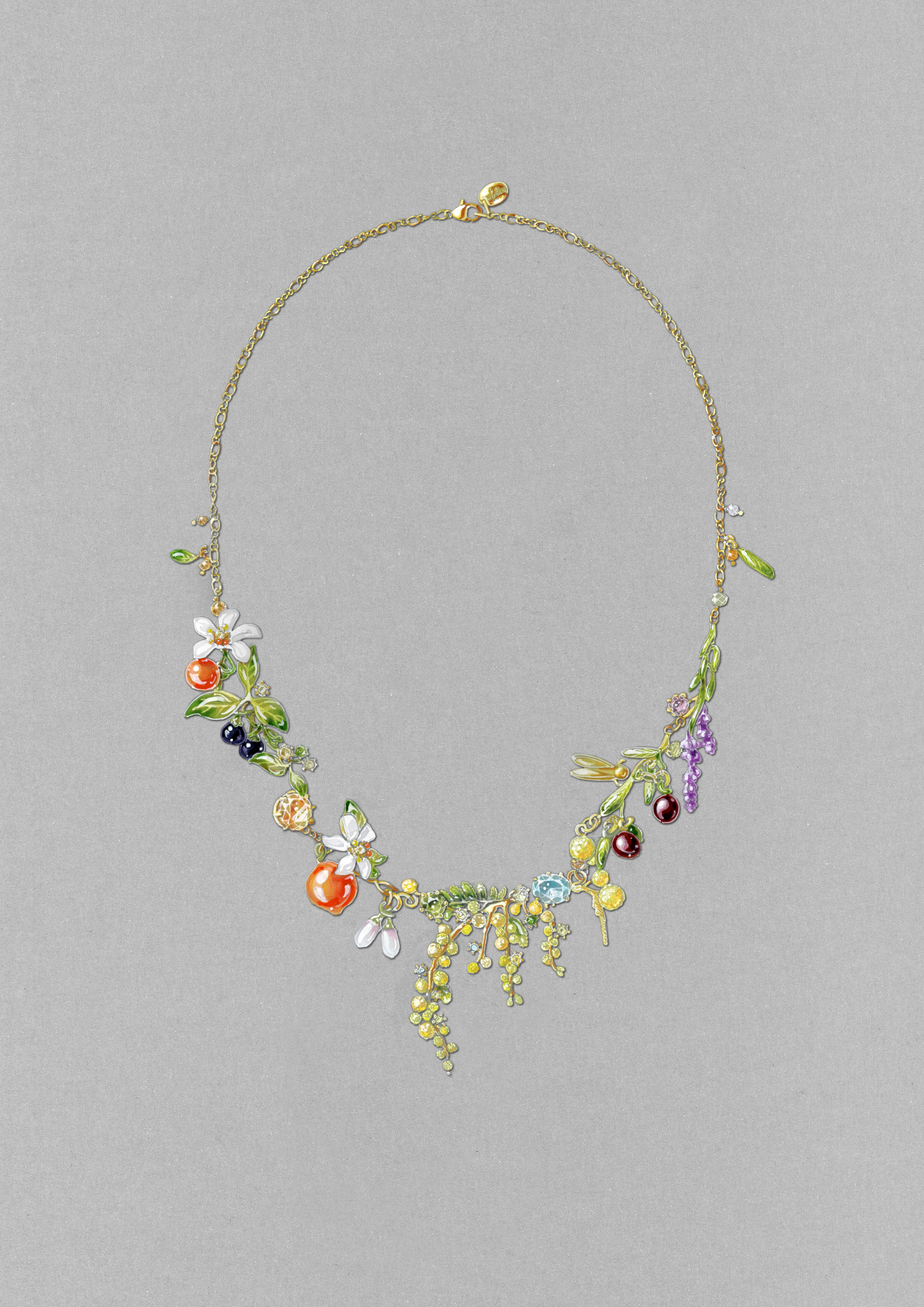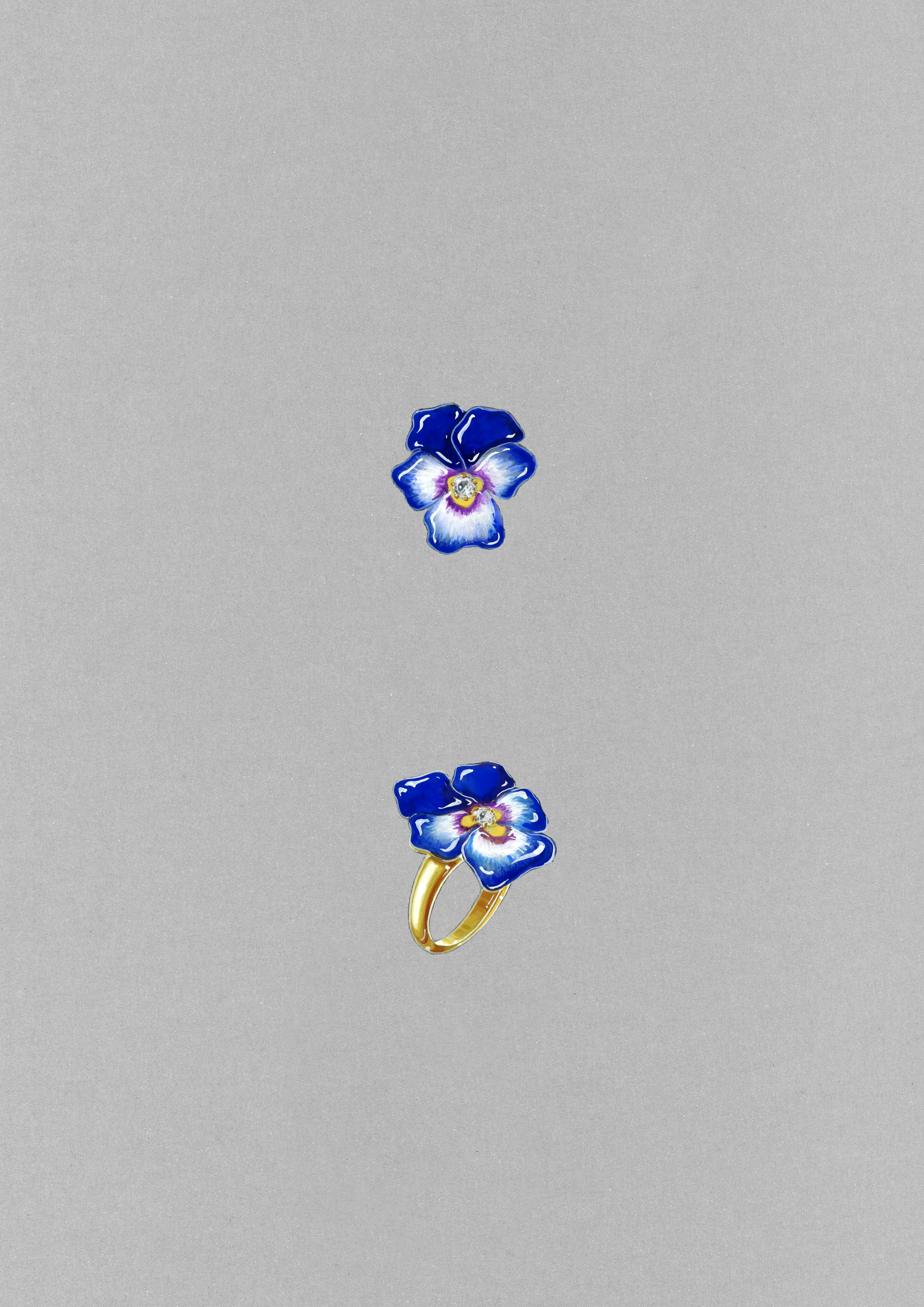 y naît d’un dessin tout droit sorti de l’imagination des créateurs. Comme en haute joaillerie, les pièces sont « gouachées ». Les bijoux sont ensuite fabriqués et subtilement peints à la main.