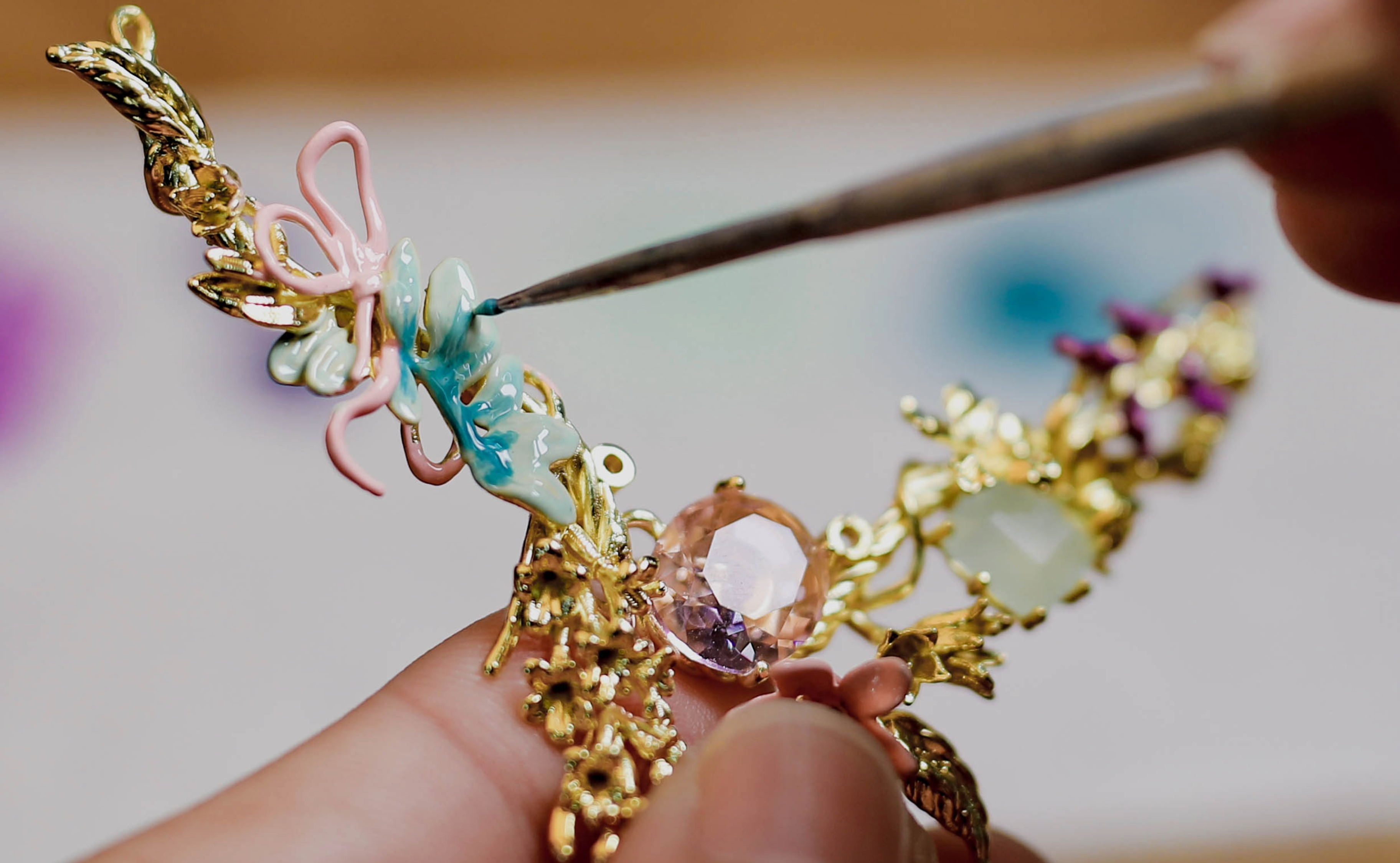 Chaque détail floral ou animalier est coloré au pinceau avec une grande subtilité dans le choix des couleurs. Une tâche minutieuse, où chaque détail est le résultat du travail à la main d’un artisan. Les pierres qui ornent les bijoux sont également taillées sur mesure, ainsi les pierres de verre de l’iconique collection La Diamantine ont été facettées spécialement pour cette occasion. Par ce travail sur le geste, chaque pièce est unique.