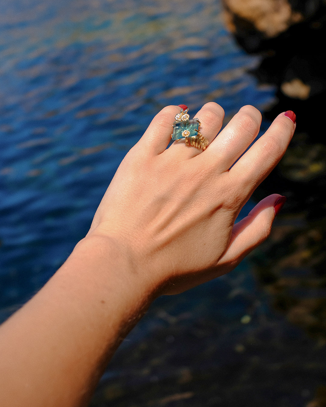 Bague pierre taillée bleue et fleurs dorées