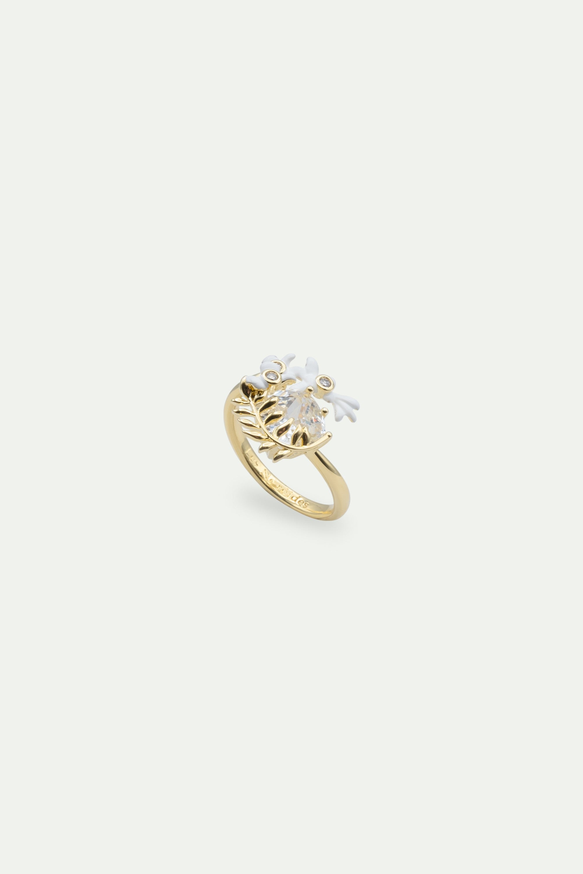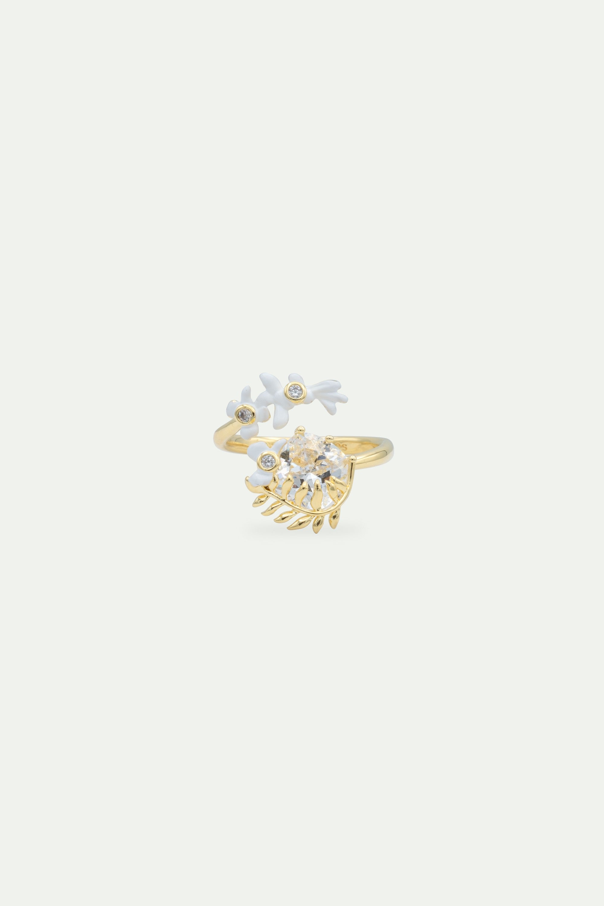 Bague ajustable glycine blanche, laurier et pierre facettée