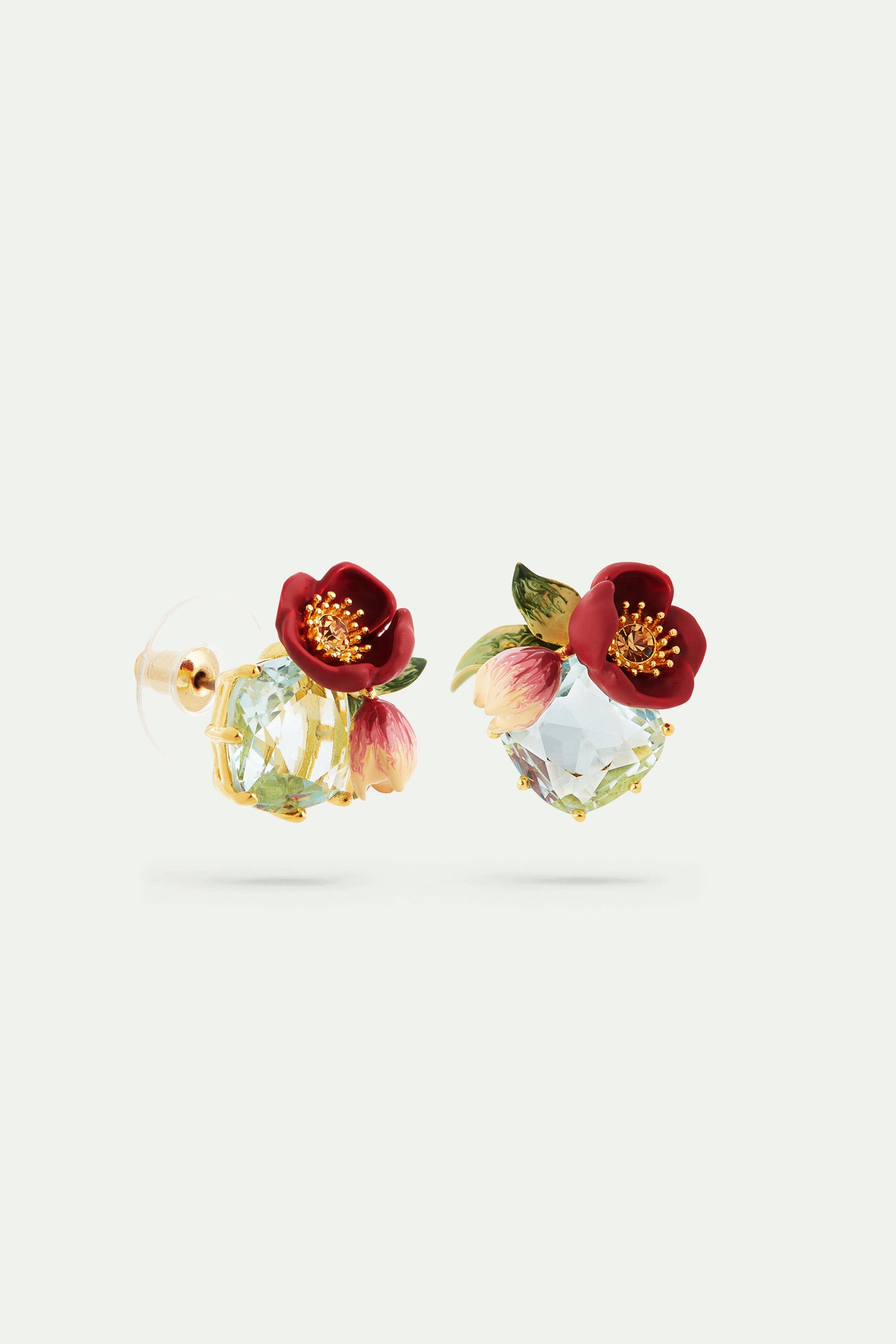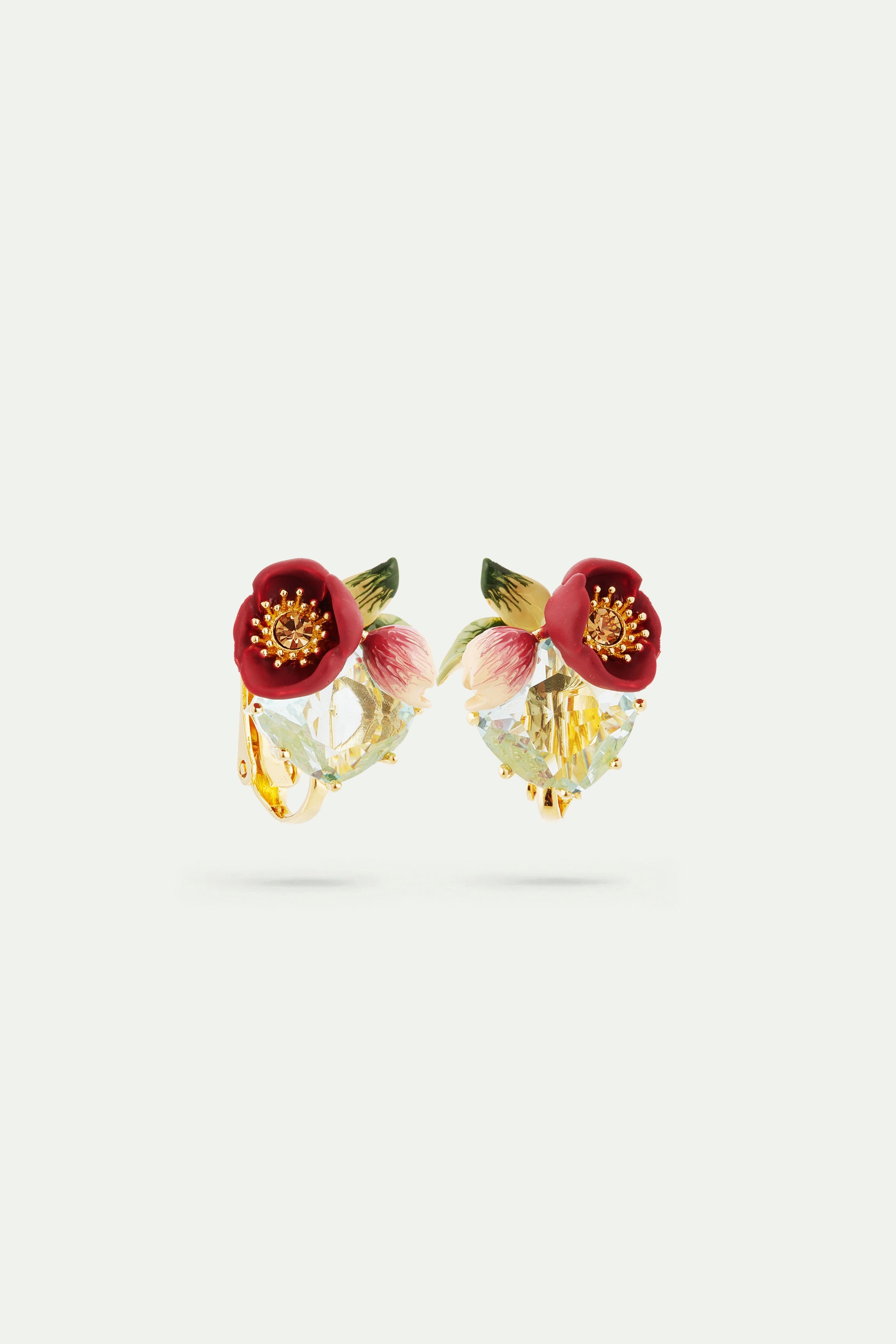 Boucles d'oreilles fleur d'hellébore rouge et pierre facettée