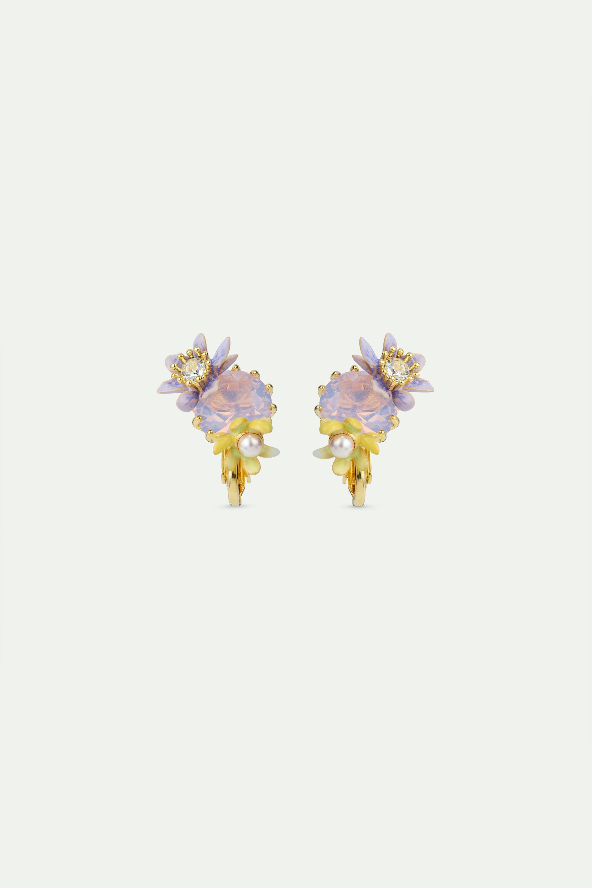 Boucles d'oreilles pierre ronde en verre facetté violet et fleurs de magnolia