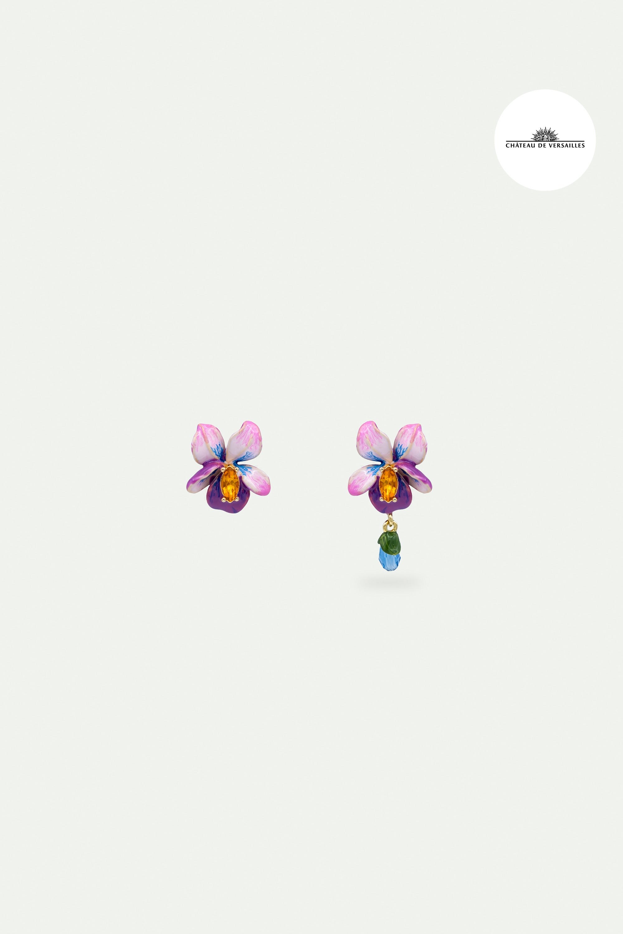 Boucles d'oreilles tiges asymétriques fleur de violette et pierre bleue