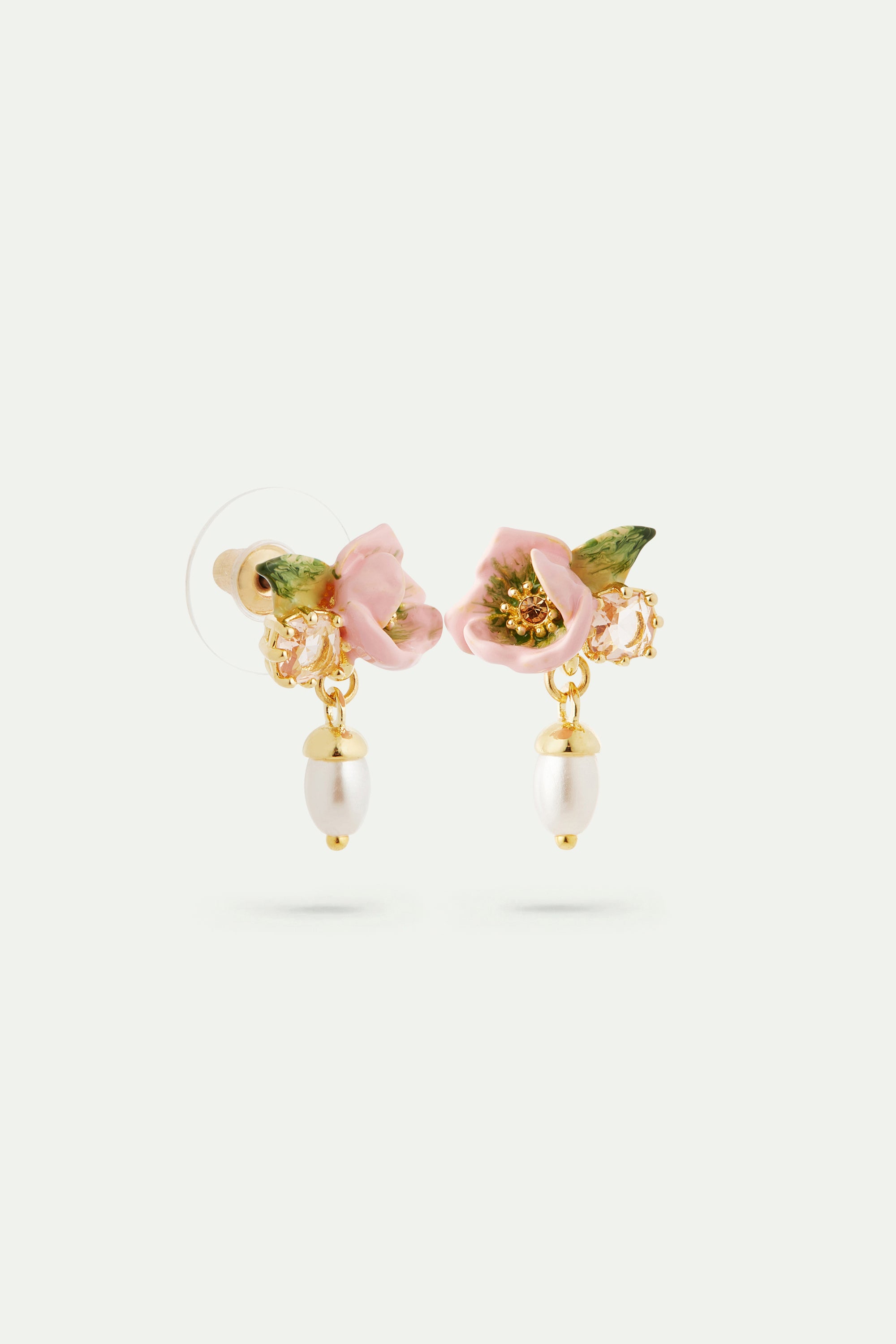 Boucles d'oreilles tiges fleur d'hellébore rose de Noël et perle fantaisie