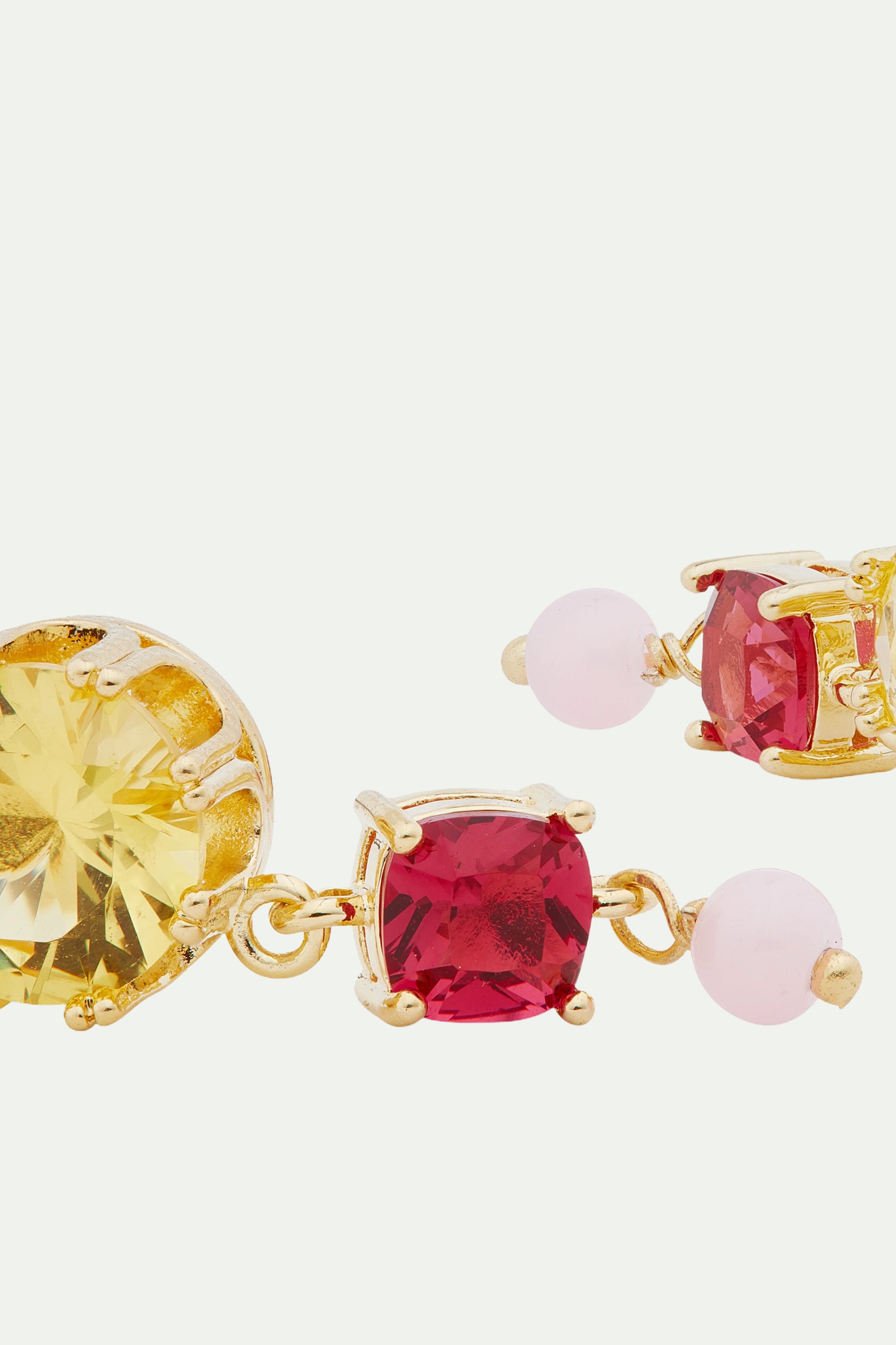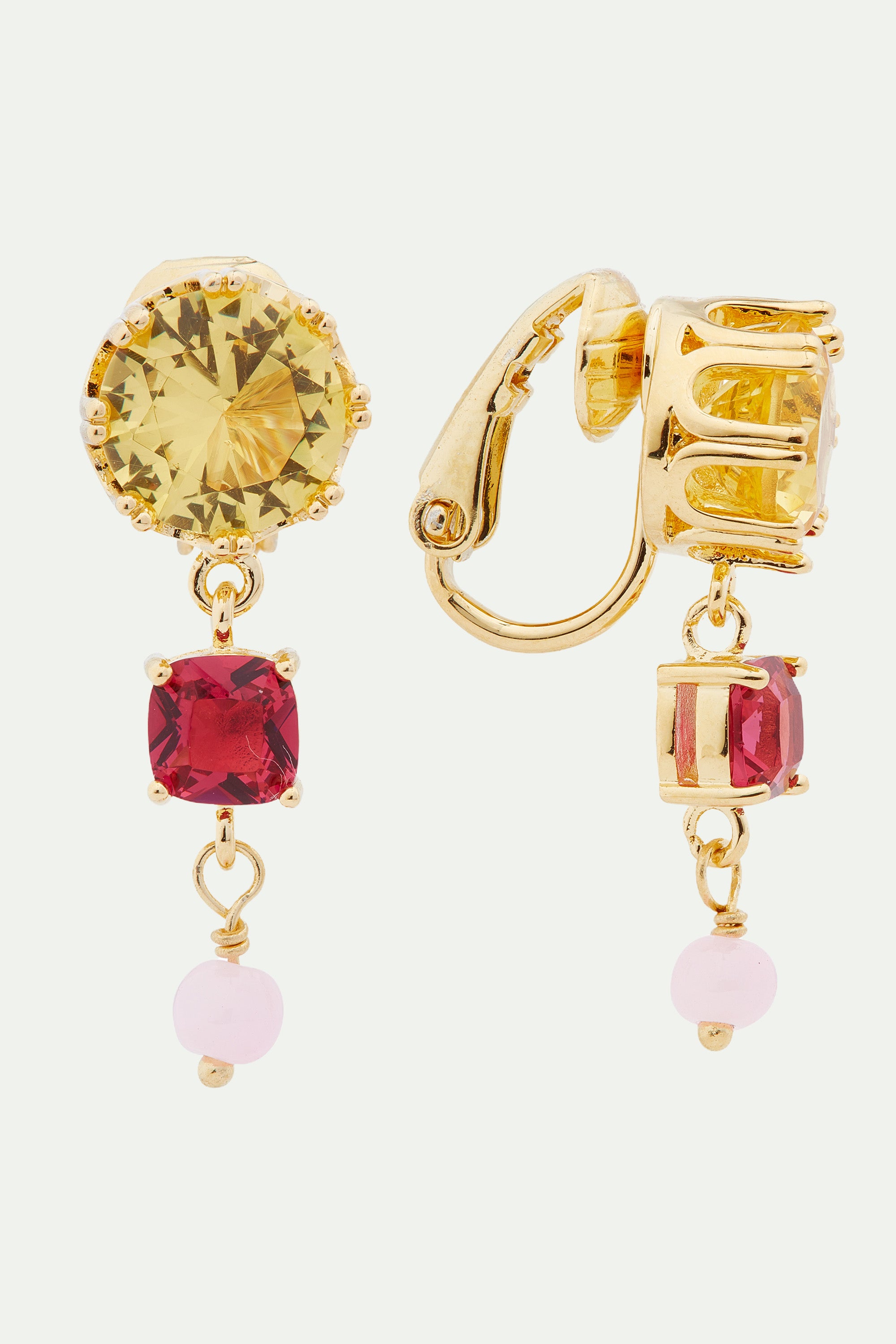Des pierres de verre au caractère précieux viennent orner ces boucles d'oreilles tiges pendantes. Elles se composent d'une première pierre ronde couleur ambre, puis d'une autre pierre carré roug...Voir plus
