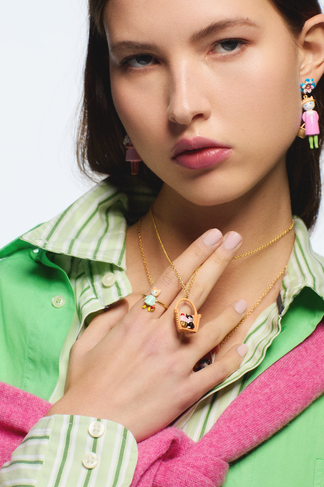 Chaque bijou naît d’un dessin tout droit sorti de l’imagination des créateurs. Comme en haute joaillerie, les pièces sont « gouachées ». Les bijoux sont ensuite fabriqués et subtilement peints à la main selon un travail de mise en couleur artisanal. Chaque détail floral ou animalier est coloré au pinceau avec une grande subtilité dans le choix des couleurs. Une tâche minutieuse, où chaque détail est le résultat du travail à la main d’un artisan. Par ce travail sur le geste, chaque pièce est unique.