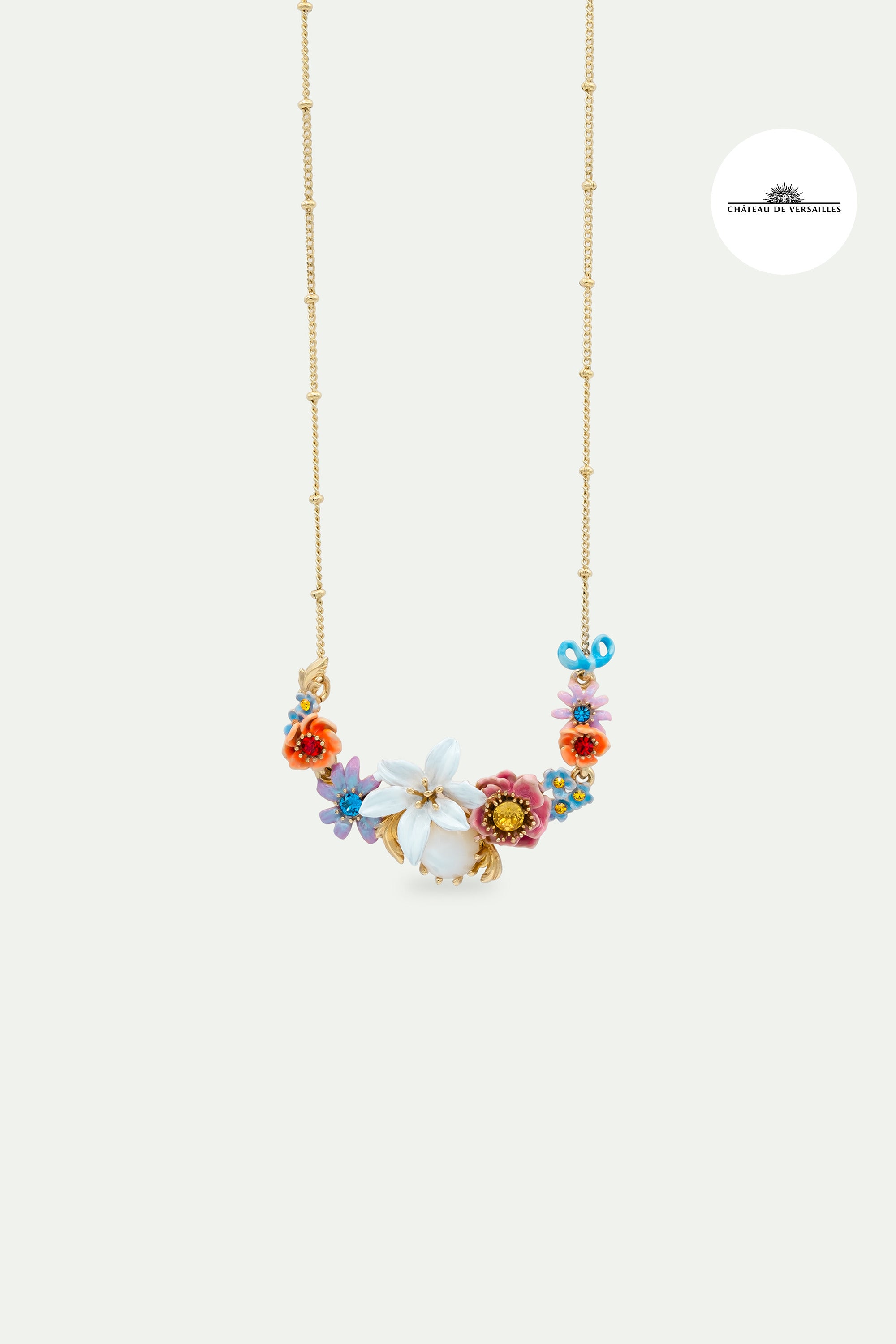 Collier plastron fleurs roses et bleues, fleur de lys et pierre ronde nacrée