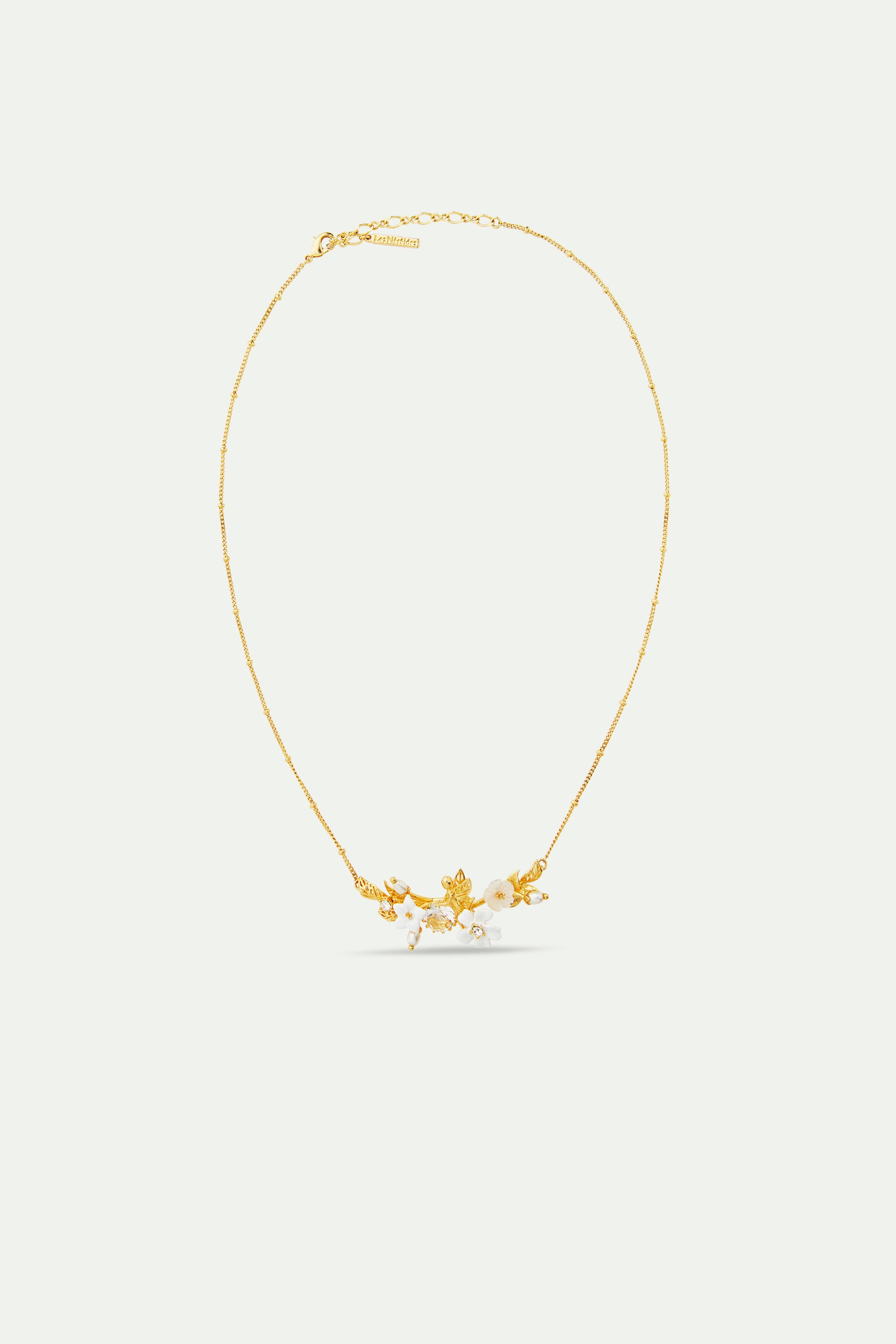 Collier plastron jasmin officinal blanc, cristal facetté et perle fantaisie