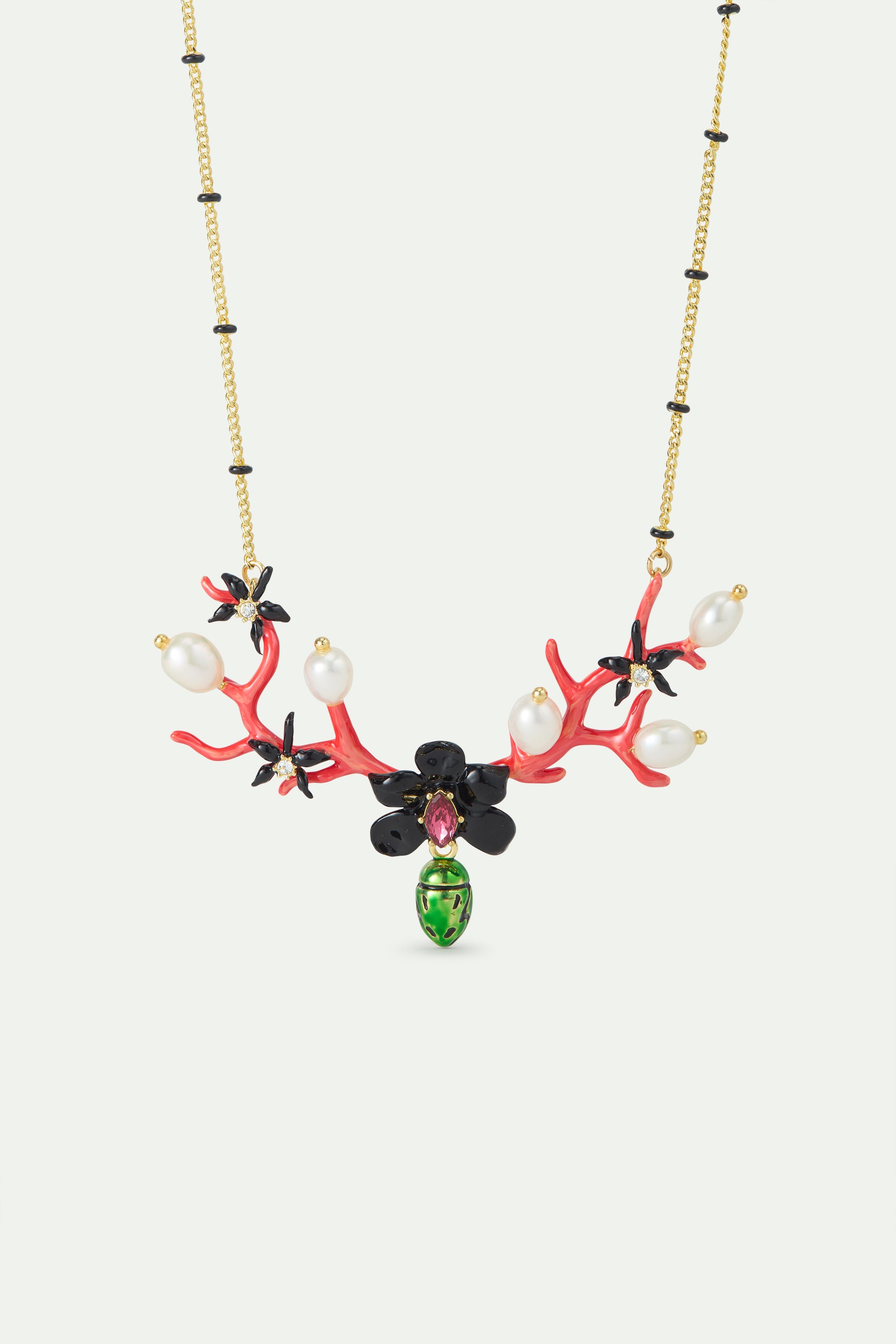 Collier plastron orchidée noire, corail rouge et perles de culture