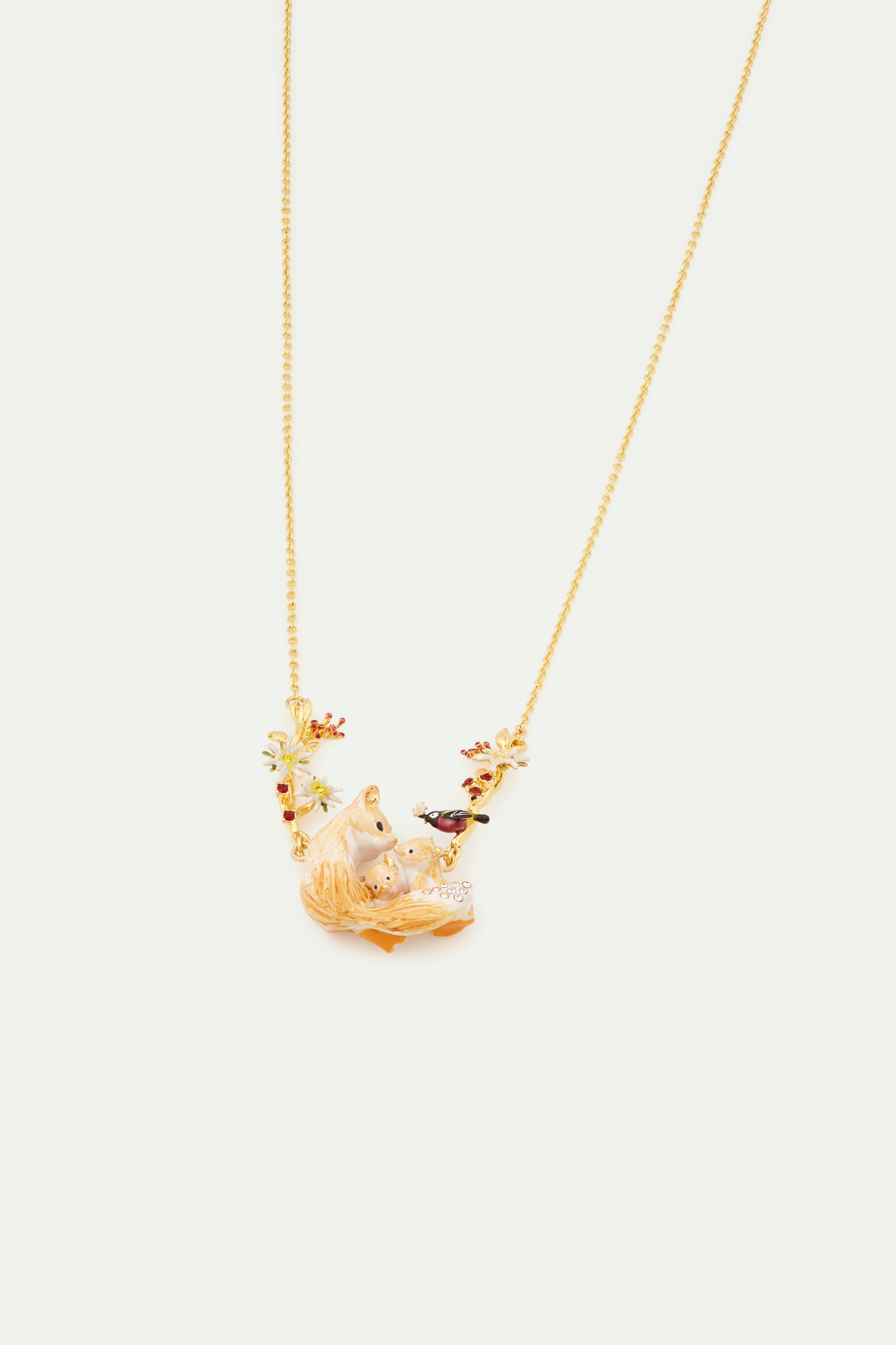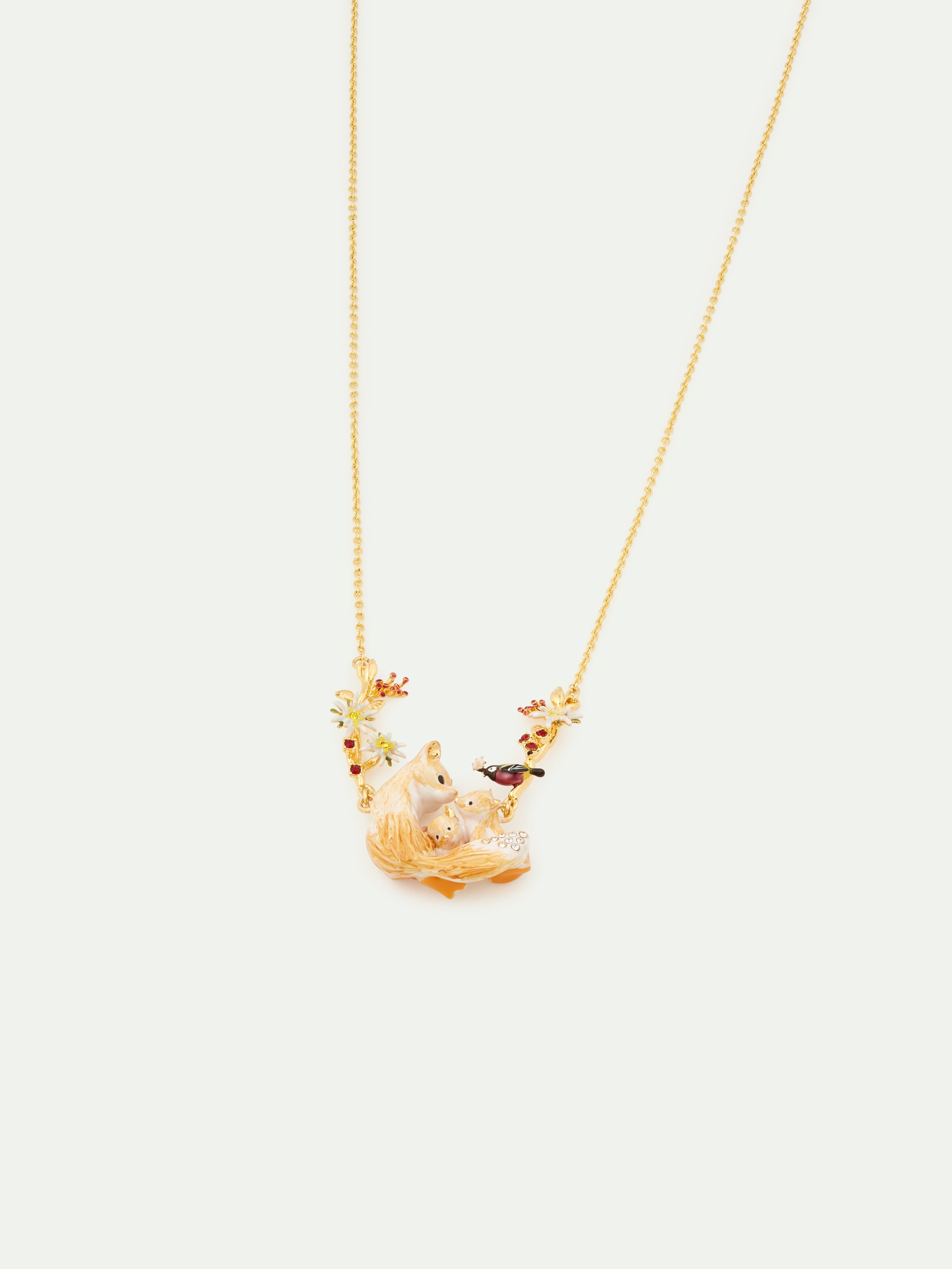 Collier plastron renards polaires, mésange variée, fleur d'edelweiss et cotonéaster